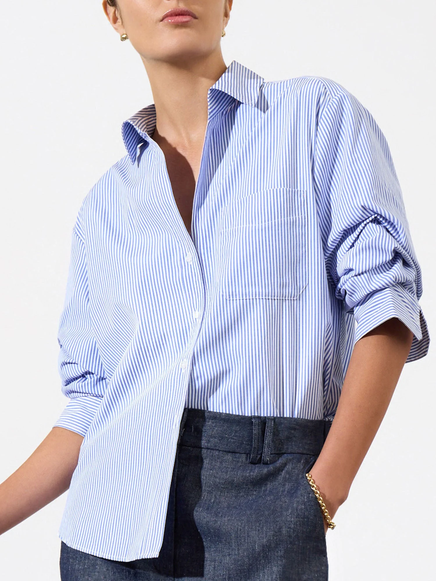 - Runs true to size - Slightly relaxed shape for an easy fit - Button front placket - Pre-styled scrunched sleeves - Grosgrain detail on the front placket - Locker loop at the back neck/yoke - 65% Polyester/35% Cotton - Length 27 ½” on Size Small - Imported - Model is 5'9" and is wearing a size Small The newest addition to our essential Shirt Collection, our Pia Shirt has the same silhouette as our bestselling Everyday Shirt, now featuring a pre-styled scrunched sleeve giving it a more sensual sensibility than our most-loved cotton shirts. In a relaxed fit, that makes it effortless, this button front shirt features special details like subtle grosgrain trim on the placket and a locker loop on the back yoke.