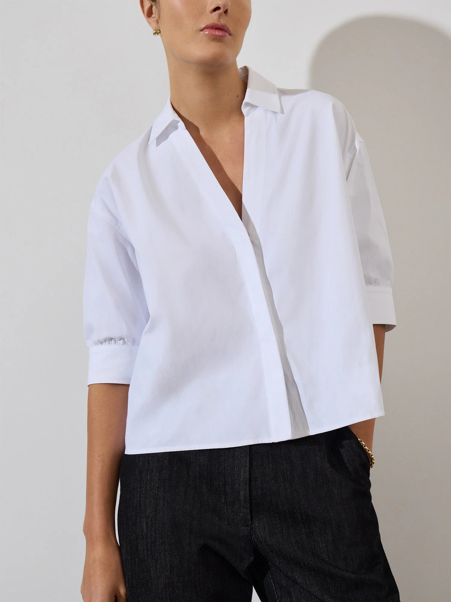 - Runs true to size - Slight blouson sleeve - Easy fit - Button front covered placket - 65% Polyester, 35% Cotton - Imported - Model is 5'9" and is wearing a size Small A fresh take on a wardrobe staple, the Rhett Shirt features a cropped length and dramatic shirred sleeves for a modern, feminine twist. Perfect worn loose or tucked for versatile styling.