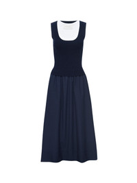 - Runs true to size - On seam pockets - Side slits - Deep hem - Midi length - 49” length based on size Small - Top: 72% Viscose, 28% Polyester - Skirt: 65% Polyester, 35% Cotton A continuation of the season’s elegant mixed media dressing, the Sofia Dress features a double layered knit top in contrasting colors. A flowing skirt falls from the waist in a cotton blend giving you the appearance of two pieces in one.