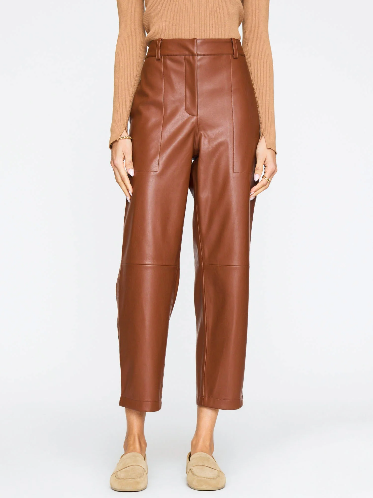 - Runs true to size - Designed to have a slightly relaxed fit - High waisted - Clean front - Elasticized back waistband - Belt loops - Slightly tapered legs - Ankle length - Length 26 ½” based on size small - Italian Fabric - 50% Polyester/50% Polyurethane - Imported - Model is 5'9" and is wearing a size Small A new addition to our sought-after Italian, vegan leather collection, our Stone Pant has a modern sensibility that sets it apart. High-waisted with a clean front and easy tapered leg, it has the vibe of your favorite relaxed jeans and that everyday chic you expect from Brochu Walker. With our signature, elasticized back for comfort and belt loops that allow you to accessorize, these ankle-length pants will be simply perfect with everything you love to wear.