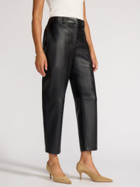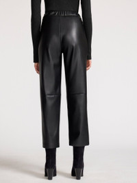 - Runs true to size - Designed to have a slightly relaxed fit - High waisted - Clean front - Elasticized back waistband - Belt loops - Slightly tapered legs - Ankle length - Length 26 ½” based on size small - Italian Fabric - 50% Polyester/50% Polyurethane - Imported - Model is 5'9" and is wearing a size Small A new addition to our sought-after Italian, vegan leather collection, our Stone Pant has a modern sensibility that sets it apart. High-waisted with a clean front and easy tapered leg, it has the vibe of your favorite relaxed jeans and that everyday chic you expect from Brochu Walker. With our signature, elasticized back for comfort and belt loops that allow you to accessorize, these ankle-length pants will be simply perfect with everything you love to wear.