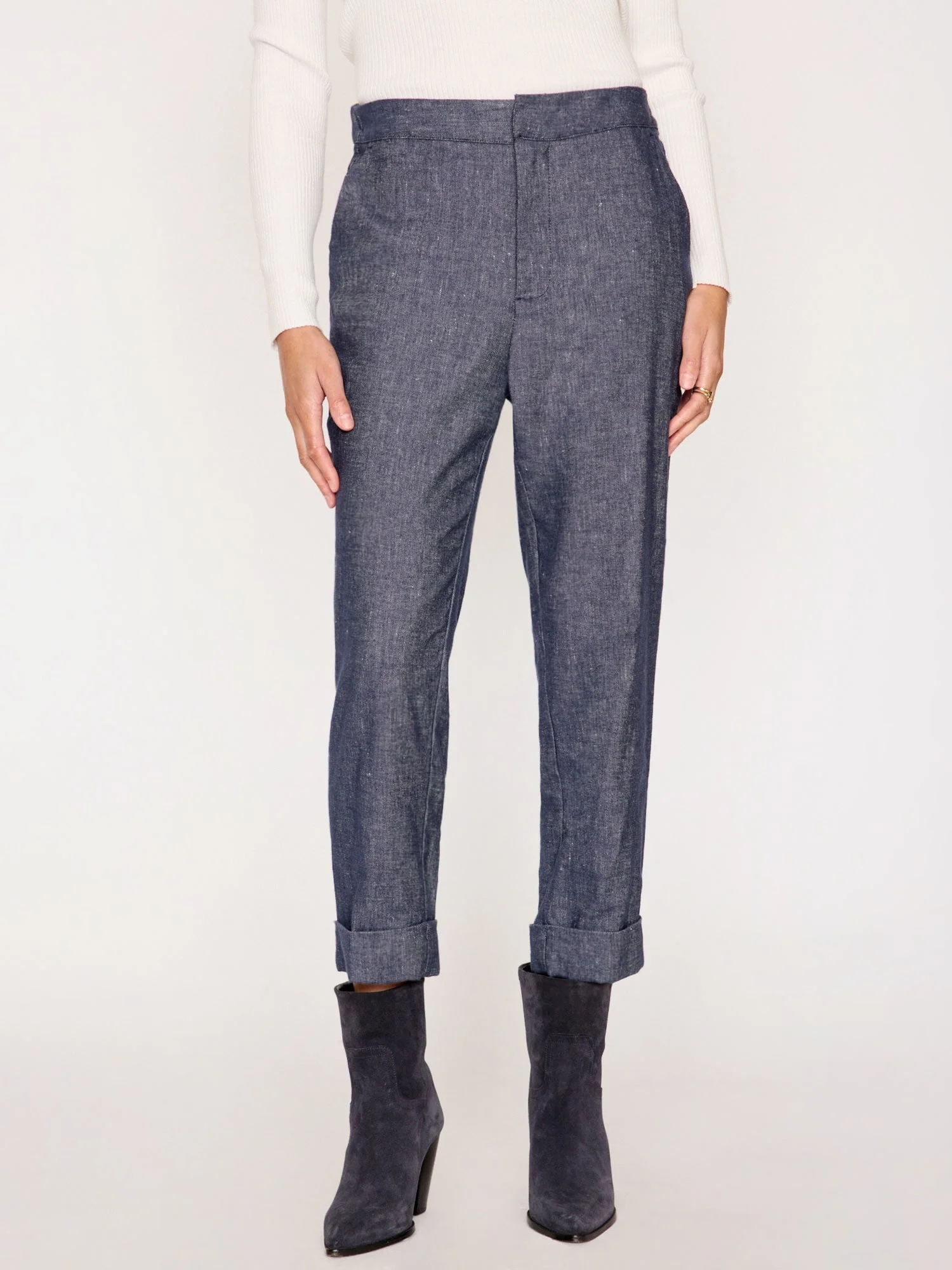 - Runs true to size - Slightly relaxed fit - Midrise - Elasticized back waistband - Flat front - Straight leg - Cuffed ankle length - Two back welt pockets with grosgrain detail - Two side slant pockets - 25" inseam - 50% Cotton/49% Linen/1% Elastane - Made In Italy of Italian Fabric - Model is 5'9 and is wearing a size Small An update to our signature, best-selling Westport Pant, this made in Prato Italy version comes in an Italian indigo fabric that has a casual, denim-like vibe. It pulls on gently for ease of wear, with an elasticized back waistband for added comfort. Modern and chic with a slightly cropped, straight leg and cuffed ankles, the Westport Pull-On Pant is a sophisticated every day, everywhere staple. Part of our ‘Kinder To The Environment’ collection, it is made from natural fibers and it is produced in Italy lowering transportation and production emissions. *Please note, due to the nature of natural Indigo, color may transfer to lighter fabrications when damp or with wear.