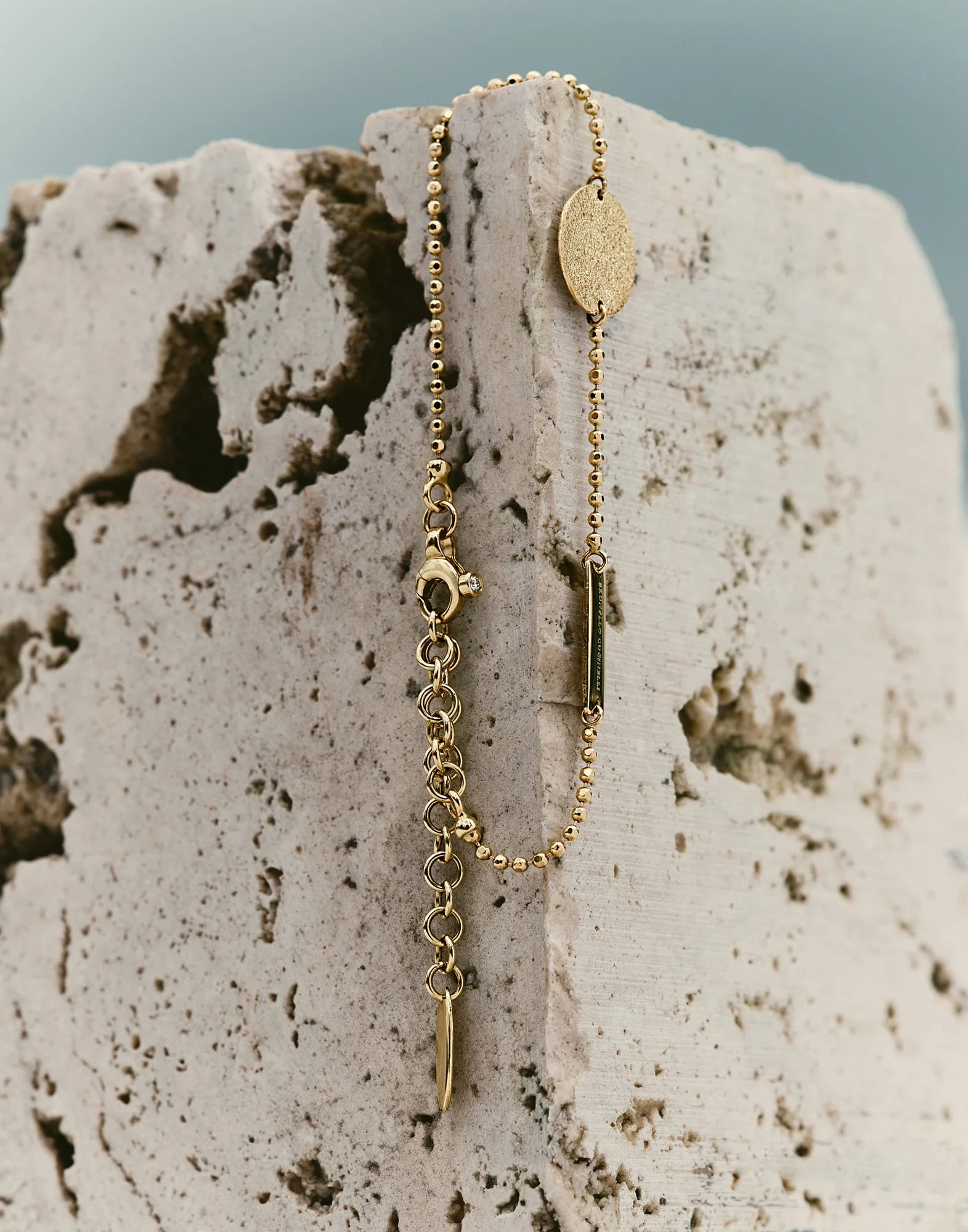 The 18K yellow Gold bracelet’s essential and sophisticated design enhances the splendor of the materials and workmanship, distinctive elements of Brunello Cucinelli style. A row of monili holds a thin small disc that spreads faceted reflections thanks to a refined artisanal finish: mirror polishing is a jeweler’s technique that uses a special bit to accentuate the Gold’s shiny effect. Set in the clasp, a round 0.015ct Diamond completes the jewelry with an “invisible” detail of sophistication. MATERIALS The 18K yellow Gold jewelry was designed and handcrafted in Umbria, the Italian region that is home to the hamlet of Solomeo. The 0.015ct Diamond which embellishes the clasp is a round cut. A fine row of 18K yellow Gold monili represents the iconic element of the Brunello Cucinelli collections and is made up of small rounded beads with a faceted effect. DETAILS The jewel is entirely made from 18 kt yellow gold Adjustable length closure clasp A 0.015 ct round brilliant cut diamond embellishes the closure clasp The maximum length of the bracelet is approximately 19 cm (7.48") Designed and Made in Italy Jewels come with a special packaging dedicated to the Aurum line 18K YELLOW GOLD