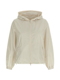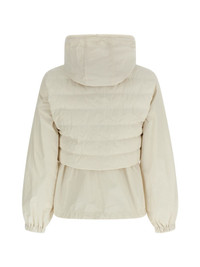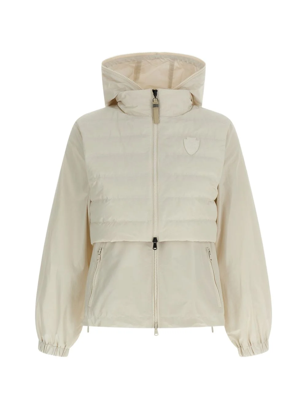 hooded quilted jacket Highlights - Beige - Heraldic coat of arms patch - Adjustable hood - Elastic cuffs - Drawstring hem - Zip closure Made in Italy Composition Cotton 54%, Polyester 46% Washing instructions Read Manufacturer Guidelines