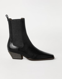 These new classic leather Chelsea boots represent the perfect mix of comfort and femininity. The tapered silhouette features a slightly squared toe and an angled heel, both country-inspired, interpreted in a very elegant way. The heel is entirely covered with the iconic shiny monili embroidery for a sparkling note in true Brunello Cucinelli style. MATERIALS The classic leather features a fine natural grain that defines the texture with a smooth, compact and semi-polished effect. The leather lining, thin leather sole and non-slip inserts provide a comfortable fit. DETAILS Elastic side gussets Leather lining Leather sole TPU rubber tread Non-slip rubber insert Nickel-free monili decoration 5 cm (1.97") heel REAL LEATHER