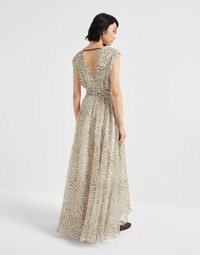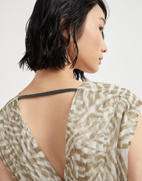 Exotic inspiration and refined materials come together in this new organza dress. The silhouette features two very feminine, lightweight pure silk organza panels which are layered to give the garment a sense of movement and airiness. The fluid lines enhance the season's Ethnic Print which delicately reinterprets the abstract animal pattern, while a shiny monili insert on the back adds a sparkling note in true Brunello Cucinelli style. MATERIALS The refined pure silk organza is characterized by an ultra-lightweight, semi-transparent texture with a crisp hand. DETAILS V-neck Off-the-shoulder style Detachable ring belt Silk-blend crepe lining Nickel-free monili decoration 100% SILK