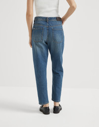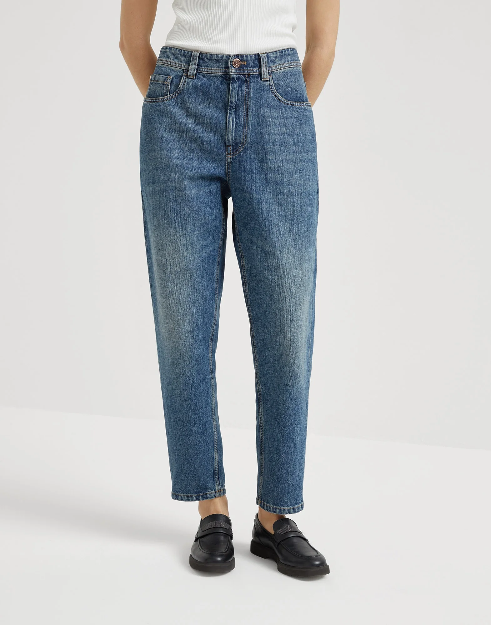 Relaxed volumes and straight lines define the informal attitude of the Baggy Tapered trousers. The soft, substantial feel of pure cotton Authentic denim enhances the casual silhouette of the trousers, which features a leg that tapers slightly at the bottom. MATERIALS The new Authentic cotton fabric maintains the characteristically full, even texture of denim, but is also pleasantly soft and comfortable to wear. The lived-in look and special nuanced effect of the color have been created thanks to various dyes and washes. As a result, its hue may evolve and naturally lighten with washing and daily use, refined traits of the fabric itself. DETAILS Zip closure with button Front pockets with watch pocket Back patch pockets 100% COTTON