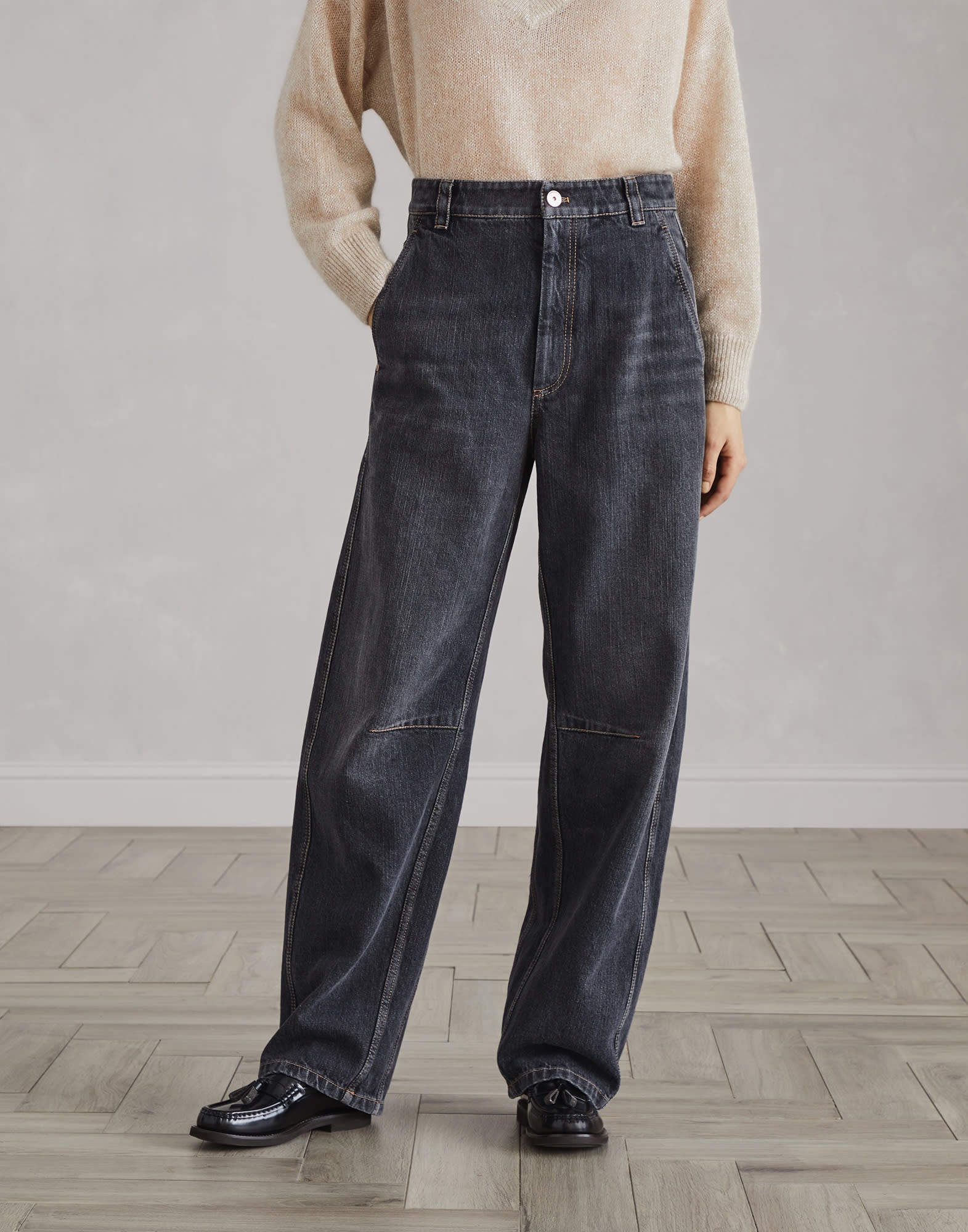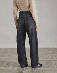 The timeless allure of Authentic denim enhances the rounded cut of these Soft Curved trousers. The contrasting stitching and the soft shape give the garment a sense of movement, creating an elegant look. The large rear patch pockets complete the casual aesthetic with modern details. MATERIALS The new Authentic cotton fabric maintains the characteristically full, even texture of denim, but is also pleasantly soft and comfortable to wear. The lived-in look and special nuanced effect of the color have been created thanks to various dyes and washes. As a result, its hue may evolve and naturally lighten with washing and daily use, refined traits of the fabric itself. DETAILS Zip closure with button Front pockets Back patch pockets 100% COTTON