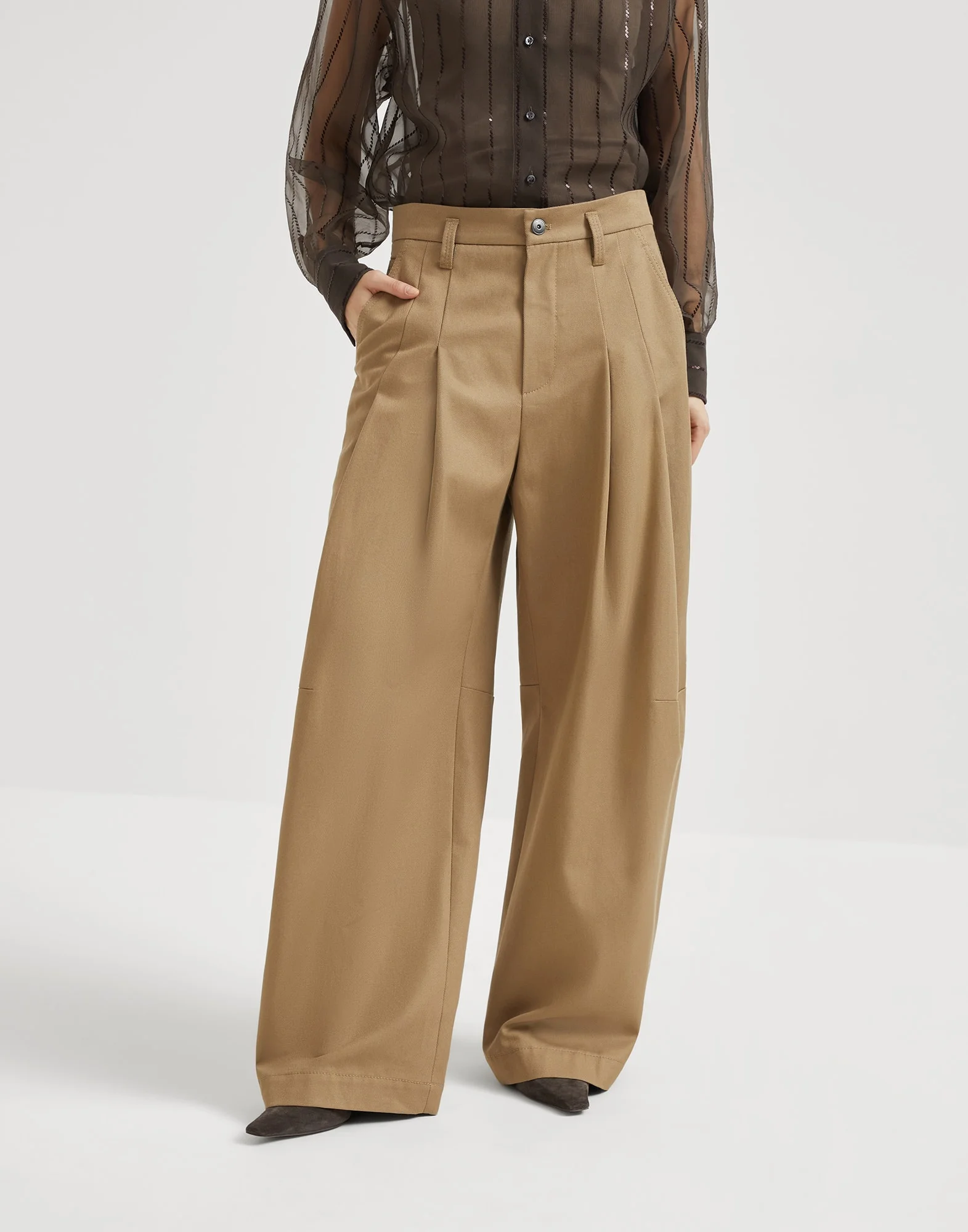 A sporty attitude and sartorial details come together in these new dyed denim five-pocket baggy trousers. The deep pleat in the front adds volume and structure, while the comfortable silhouette features a wide, relaxed cut down the leg. The shiny monili detail completes the garment with a feminine sparkle in true Brunello Cucinelli style. MATERIALS Soft and lightweight, the pure cotton denim is garment-dyed in the season’s delicate colors. DETAILS Zip closure with button Jeans-style front pockets with watch pocket Double pleat Back patch pockets Nickel-free monili decoration 100% COTTON
