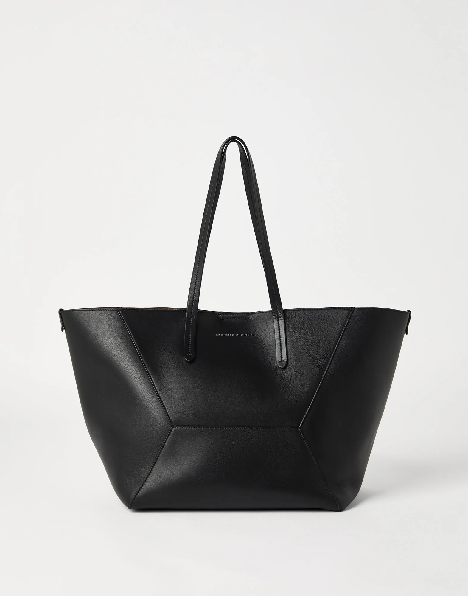 The calfskin BC Duo bag reinterprets the classic "everyday bag" in true Brunello Cucinelli style. With an ultra-soft hand, the leather enhances the accessory’s contemporary feel, highlighted by bold stitching that emphasizes the squared, minimal lines. A removable internal zipper pouch and the practical magnetic closure complete the style, while two monili embroideries add a feminine, sparkling note. If fastened, the internal ties on the sides allow the shape of the bag to change, making it more compact. MATERIALS Calfskin leather showcases a smooth, soft and even texture. The surface’s slightly matte appearance brings out the colors of the season with an intense, rich effect. DETAILS Magnetic snap closure Double handle Leather lining Internal pocket with zip closure Nickel-free monili decoration Bag is 53 cm (20.87") long, 25 cm (9.84") wide and 27 cm (10.63") high 100% REAL LEATHER