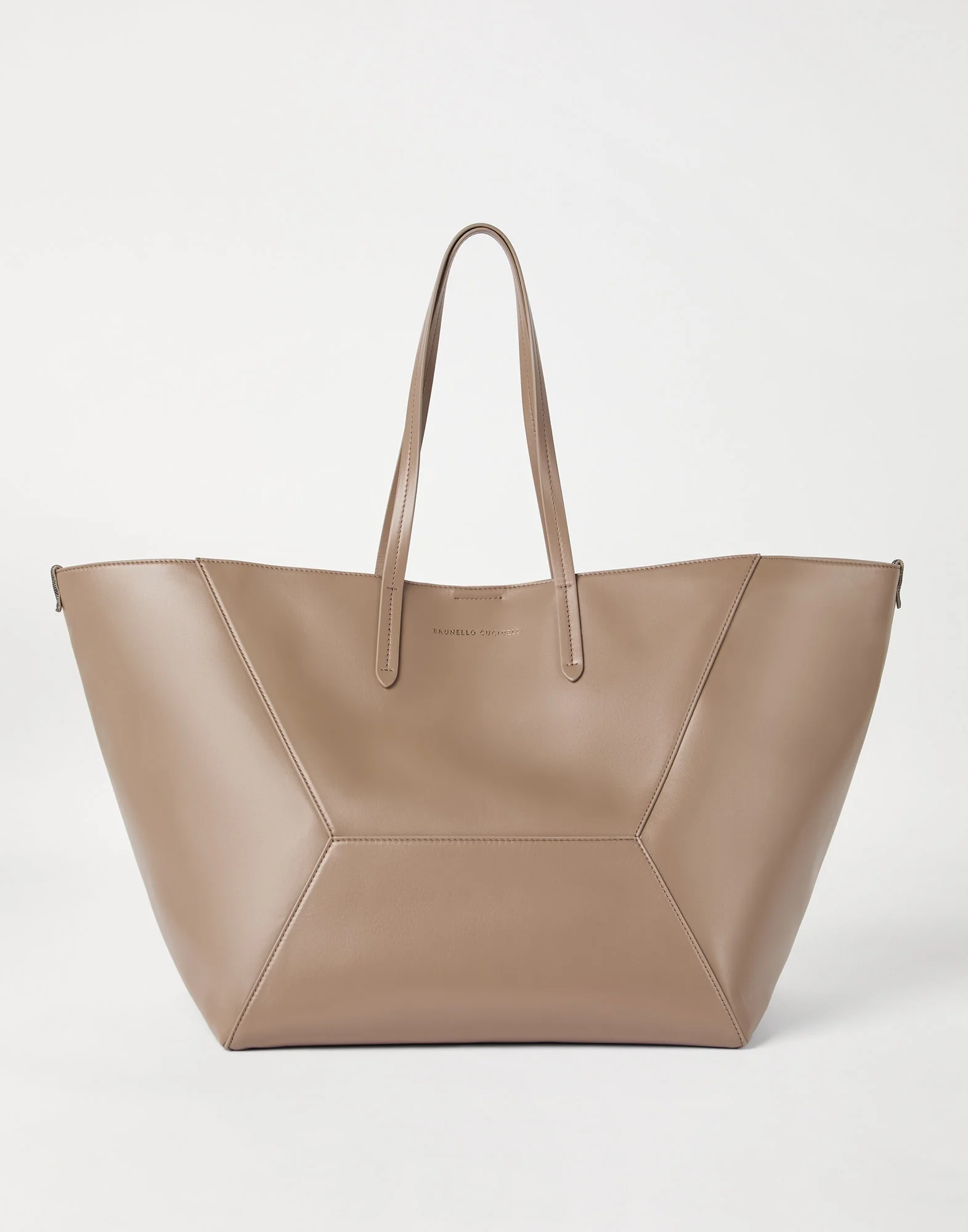 This calfskin BC Duo large bag reinterprets the classic "everyday bag" in true Brunello Cucinelli style. The refined leather enhances the season’s colors with its rich, even texture, highlighting the visible seams that emphasize the square, minimal lines. Offered in an even more spacious version, the bag features two internal ties on the sides that, when fastened, allow the shape to change, making it more compact. Two monili embroideries complete the design with a delicate feminine sparkle. MATERIALS The refined calfskin showcases a smooth, soft and even texture. The leather’s matte appearance brings out the season’s colors with an intense, rich effect. DETAILS Magnetic snap closure Double handle Leather lining Detachable internal pochette with zipper Nickel-free monili decoration Bag is 62 cm (24.41") long, 29 cm (11.42") wide and 32 cm (12.60") high REAL LEATHER