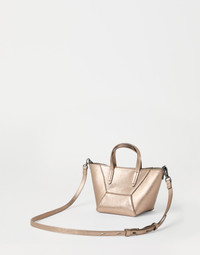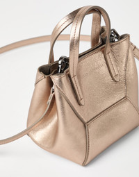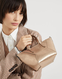 This new "mini" design reinterprets the iconic BC Duo bag of the Brunello Cucinelli collections. The metallic reflections of the refined lame calfskin gives a shimmering appearance to the accessory, which features eye-catching seams that emphasize the square, minimalist lines. Offered in a smaller size for a very elegant, casual feel, the bag features two internal ties on the sides that, when fastened, allow the shape of the bag to change, making it more compact. The practical magnetic closure and the removable shoulder strap complete the style, while two monili embroideries add a feminine sparkling note. MATERIALS The refined leather is enriched with a special finish that gives the texture a shiny, metallic effect. DETAILS Magnetic snap closure Adjustable and detachable shoulder strap Double handle 1 slot for cards and business cards Suede lining Nickel-free monili decoration Bag is 25 cm (9.84") long, 10 cm (3.94") wide, and 14 cm (5.51") high 100% REAL LEATHER