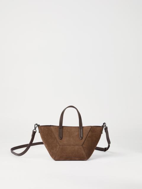 This new mini BC Duo bag reinterprets the iconic "everyday bag" design of the Brunello Cucinelli collections. The velvety texture of suede enhances the season's colors and highlights the eye-catching seams that emphasize the bag's squared, minimalist lines, offered in a smaller size for a very elegant, casual feel. If fastened, the internal ties on the sides allow the shape of the bag to change, making it more compact. The practical magnetic closure and the removable shoulder strap complete the style, while two monili embroideries add a feminine sparkling note. MATERIALS The refined suede is a compact leather with a soft, velvety texture. A leather lining completes the look of the bag. DETAILS Magnetic snap closure Adjustable and detachable shoulder strap Double handle Leather lining 1 slot for cards and business cards Nickel-free monili decoration Bag is 25 cm (9.84") long, 10 cm (3.94") wide, and 14 cm (5.51") high REAL LEATHER