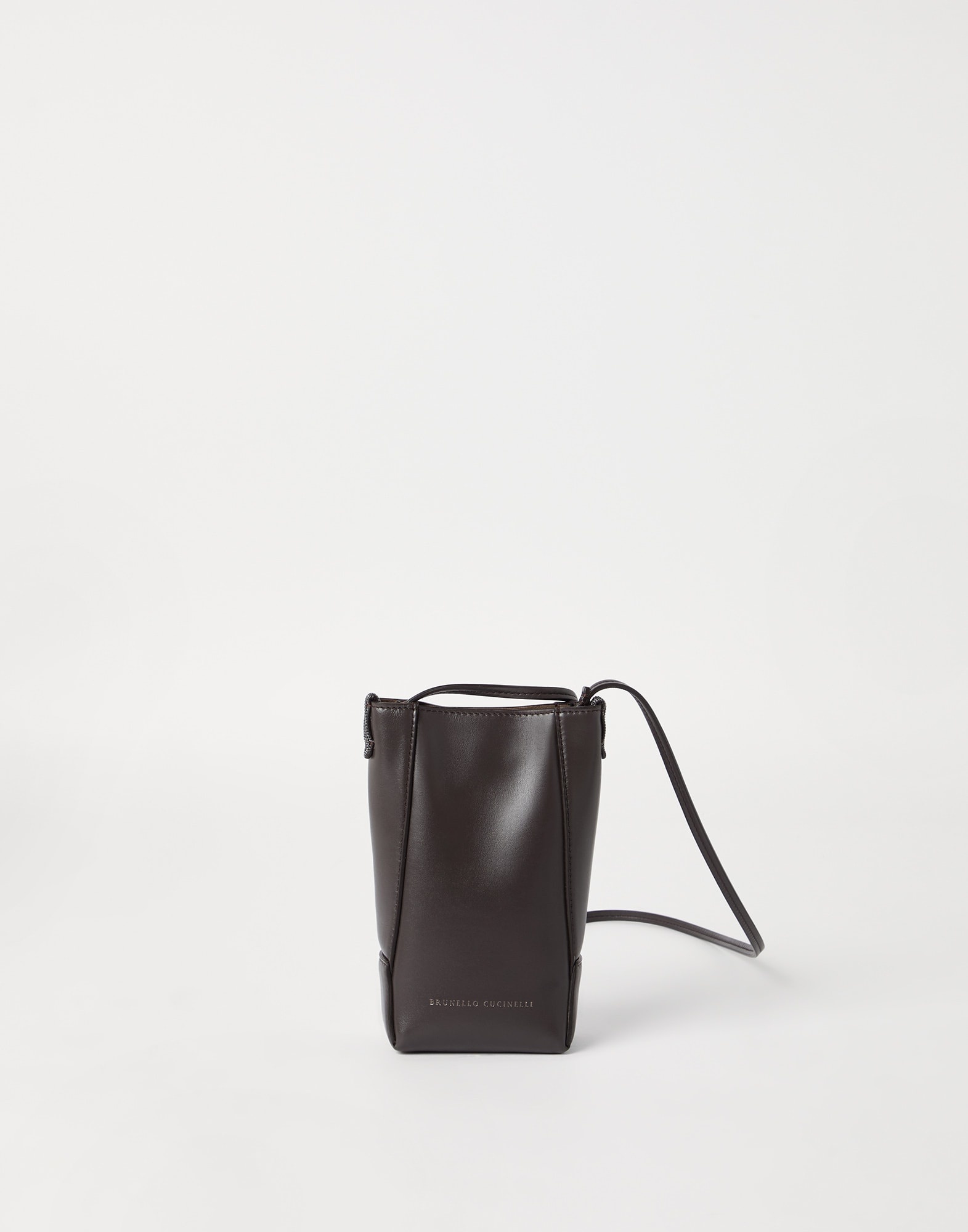 A new accessory enriches the season’s outfits with a practical touch that is contemporary at the same time. The BC Duo phone holder is made of refined calfskin with an ultra-soft hand that enhances the season's colors. The rows of shiny monili embroidered edges complete the accessory with a sparkling detail in true Brunello Cucinelli style. MATERIALS The refined calfskin showcases a smooth, soft and even texture. The surface’s slightly matte appearance brings out the collection’s colors with an intense, rich effect. DETAILS Magnetic snap closure Shoulder strap Suede lining Nickel-free monili decoration Bag is 14 cm (5.51") long, 5 cm (1.97") wide, and 19 cm (7.48") high REAL LEATHER
