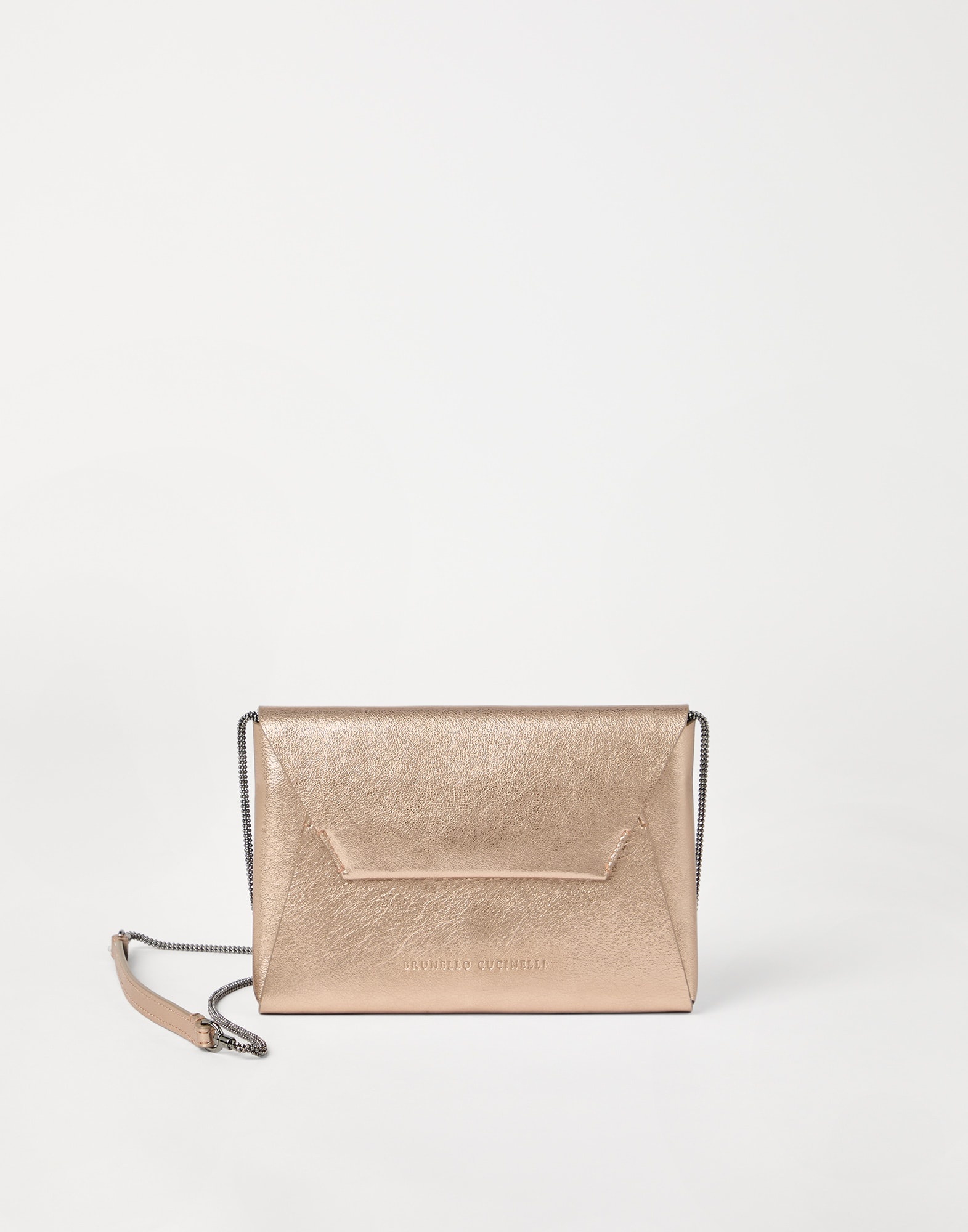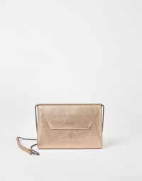 An elegant, extremely feminine aesthetic is paired with Brunello Cucinelli’s refined materials and sparkling details in this lame calfskin BC Duo clutch bag. The shiny appearance of the entire silhouette, created thanks to a special finishing, meets an essential shape reminiscent of a classic envelope bag. To embellish the design, four rows of shiny monili create the shoulder strap that can be removed, allowing the clutch to be carried in hand, for countless styling options. MATERIALS The refined leather is enriched with a special finish that gives the texture a shiny, metallic effect. DETAILS Magnetic snap closure Shoulder strap Leather lining 1 slot for cards and business cards Nickel-free monili decoration Accessory is approx. 21 cm (8.27") long, 14.5 cm (5.71") high, and 2 cm (0.79") wide 100% REAL LEATHER