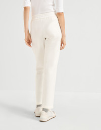 Refined Brunello Cucinelli materials are paired with the casual style of the Travelwear line, dedicated to moments of relaxation and leisure. Characterized by an informal yet refined texture, the fabric is paired with a comfortable, relaxed silhouette, enhanced by the waist drawstring detail. The shiny monili embroidery, the iconic embellishment of the Brunello Cucinelli collections, gives a feminine sparkle to the garment. MATERIALS The stretch characteristic of the lightweight cotton French terry makes the garment comfortable to wear. DETAILS Pull-up trousers with drawstring Front pockets Nickel-free monili decoration 98% COTTON, 2% ELASTANE