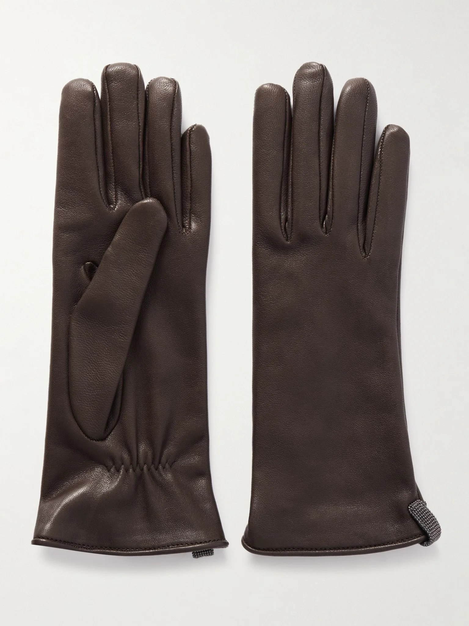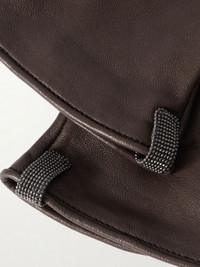 Brunello Cucinelli's gloves have been crafted in Italy from leather that's incredibly soft and supple. They're lined in silk and embellished with the label's light-catching 'Monili' beads at the wrist. Details & Care - Brown leather - 100% leather (Lamb); lining: 100% silk - Specialist clean