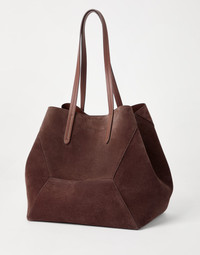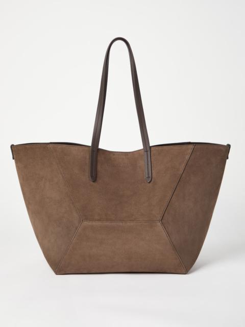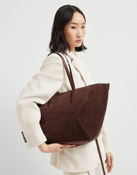 The suede BC Duo bag reinterprets the classic "everyday bag" in true Brunello Cucinelli style. Ultra-soft and compact, the suede enriches the geometric silhouette highlighted by bold stitching that emphasizes the design’s squared, minimal lines. A removable internal zipper pouch and the practical magnetic closure complete the style, while two monili embroideries add a feminine sparkling note. If fastened, the internal ties on the sides allow the shape of the bag to change, making it more compact. MATERIALS The refined suede is a compact leather with a soft, velvety texture. A leather lining completes the look of the bag. DETAILS Magnetic snap closure Double handle Detachable internal pochette with zipper Nickel-free monili decoration Bag is approximately 53 cm (20.87") long, 25 cm (9.84") wide, and 27 cm (10.63") high 100% REAL LEATHER