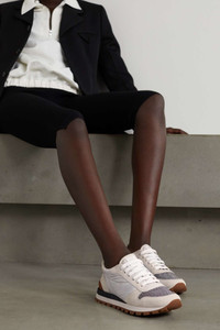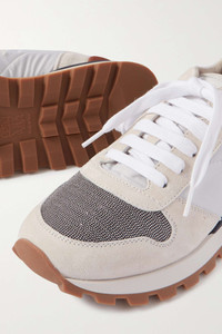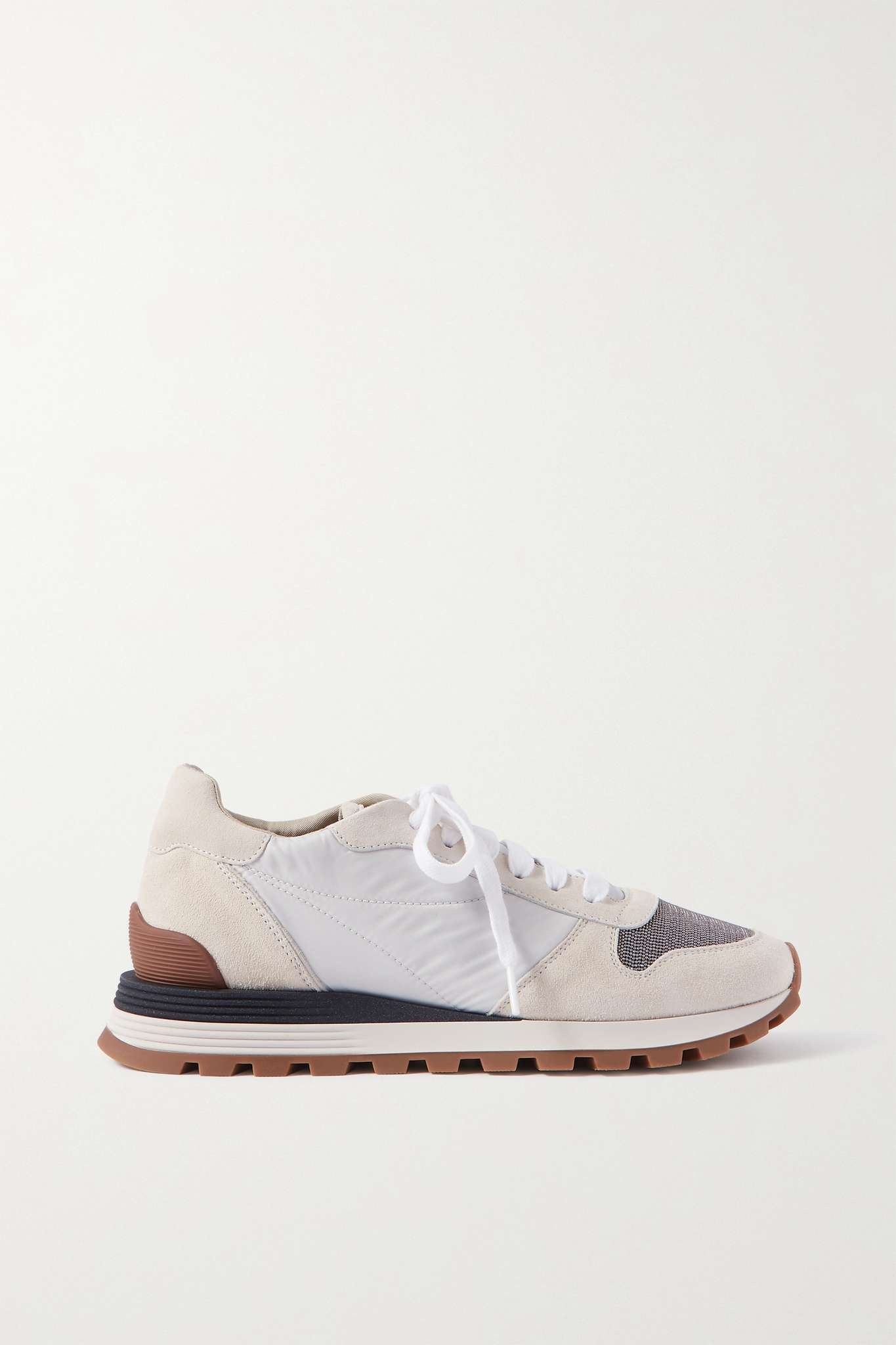 EDITORS'NOTES Brunello Cucinelli's sneakers are crafted with the same level of precision as the brand's ready-to-wear pieces. Made in Italy from durable white nylon, they have light-gray suede trims with signature monili beads at the front. SIZE & FIT - Fits true to size, take your normal size - Italian sizing DETAILS & CARE - Rubber sole measures approximately 25mm/ 1 inch - White nylon, light-gray suede (Calf) - Lace-up front