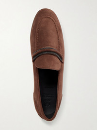 Brunello Cucinelli's loafers are embellished with signature Monili beads along the straps – a detail that fans of the brand will instantly recognize. Crafted in Italy from suede, they have round toes and rest on stacked heels. Wear yours with jeans and tailoring alike. Size & Fit - Fits true to size, take your normal size - Only available in full sizes, go up to the nearest whole size if you take a half size - Italian sizing Details & Care - Heel measures approximately 15mm/ 0.5 inches - Dark-brown suede (Calf) - Slip on
