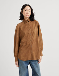 Refined Brunello Cucinelli materials revisit the tradition of shirting in this new suede shirt. With an extremely soft hand, the sophisticated leather updates the essential nature of the classic shirt silhouette, characterized by slightly oversized proportions for a relaxed appearance. The iconic monili embroidery completes the design with a delicate sparkle. MATERIALS Refined suede is a thin leather with a soft, velvety hand. DETAILS Horn button closure Classic collar Cuffs have two horn buttons Nickel-free monili decoration 100% REAL LEATHER