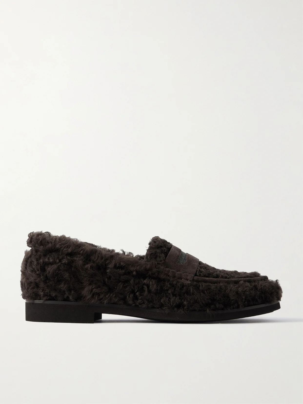 Brunello Cucinelli's fluffy shearling loafers are the kind of cool style that comes to mind when hearing the phrase "dress from the feet up". They have suede penny straps encrusted with the house's signature 'Monili' beads and are set on slight heels for comfortable lift.