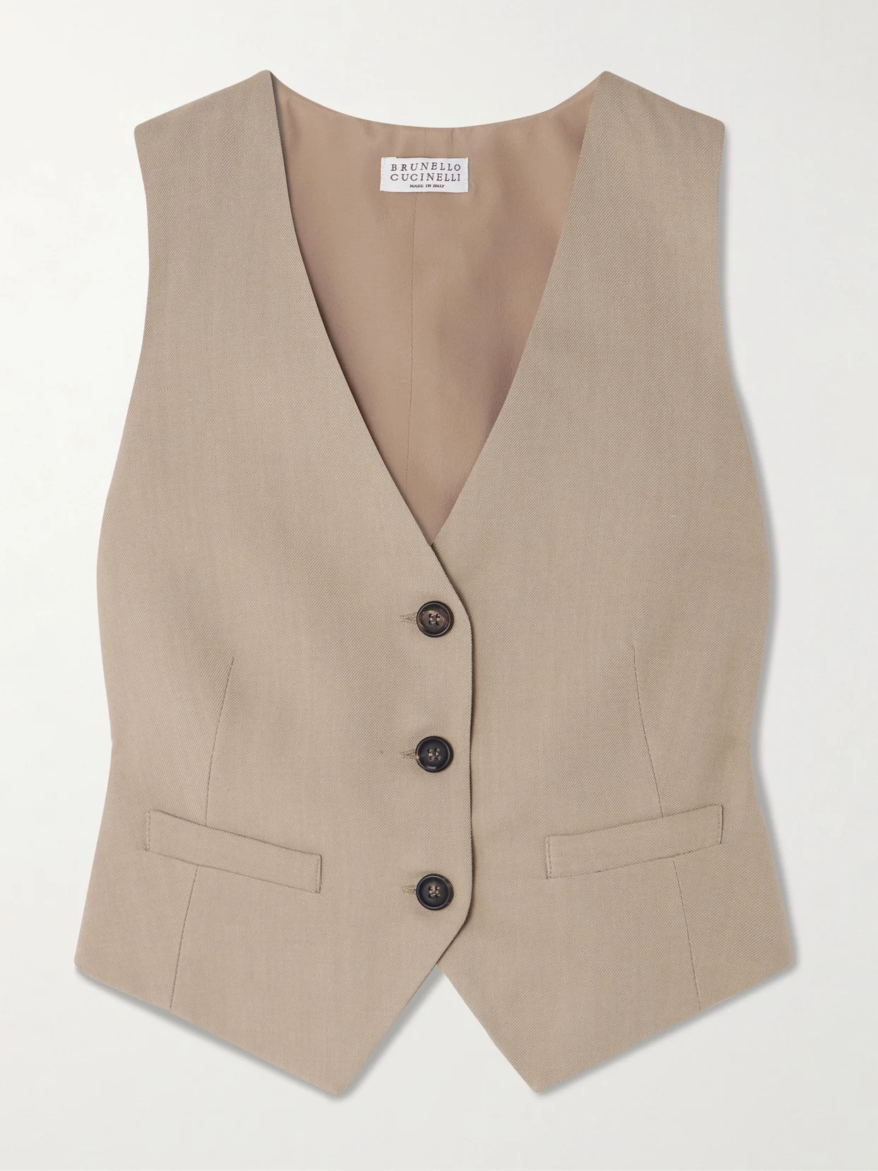 EXCLUSIVE AT NET-A-PORTER. Brunello Cucinelli's vest has been made in Solomeo, a medieval Italian hamlet that's served as the brand's base for four decades. It's cut from twill with touches of linen and has a buckled back tab and Monili beads along the neck. Wear yours solo or as part of a three-piece suit.