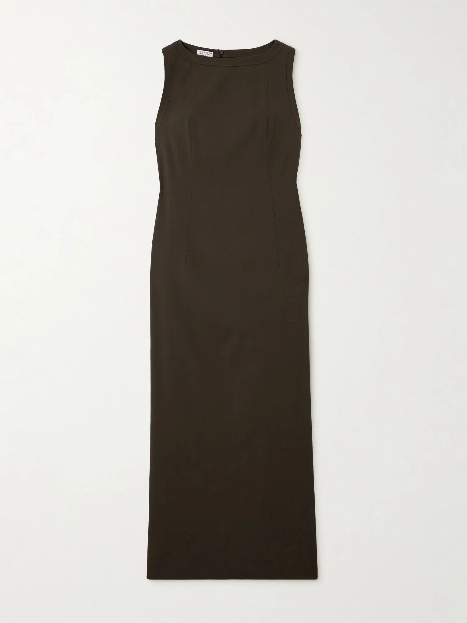 Brunello Cucinelli's maxi dress has an elegant column-like cut that'll skim your frame. Made from wool-blend twill, it has an classic boat neckline embellished with Monili beads and is darted for definition. Wear it with point-toe flats or mules. Size & Fit - Fits true to size, take your normal size - Designed for a slightly loose fit - Mid-weight, slightly stretchy fabric - Model is 177cm/ 5'10" and is wearing a size Small Model measurements: - Bust: 80cm/ 31.5" - Waist: 60cm/ 23.5" - Hip: 89cm/ 35" Details & Care - Dark-brown wool-blend twill - Concealed zip fastening along back - 76% virgin wool, 22% viscose, 2% elastane; lining: 74% acetate, 26% silk - Fully lined - Dry clean