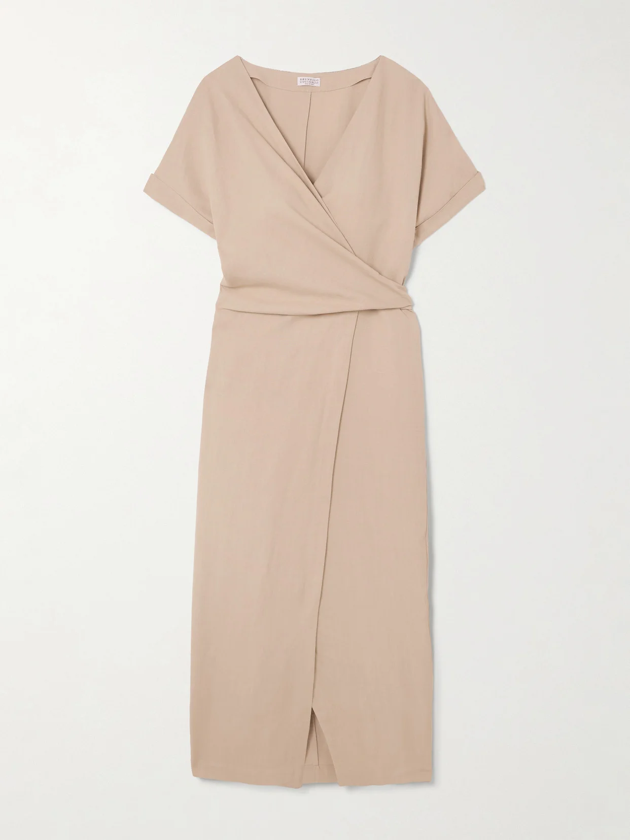 Brunello Cucinelli's dress makes a classic year-round choice. Woven with a touch of linen in the label's versatile 'Sandstorm' shade, it has a wrap front and rolled cuffs. At the back, the neck is traced with Monili as a sparkling signature.