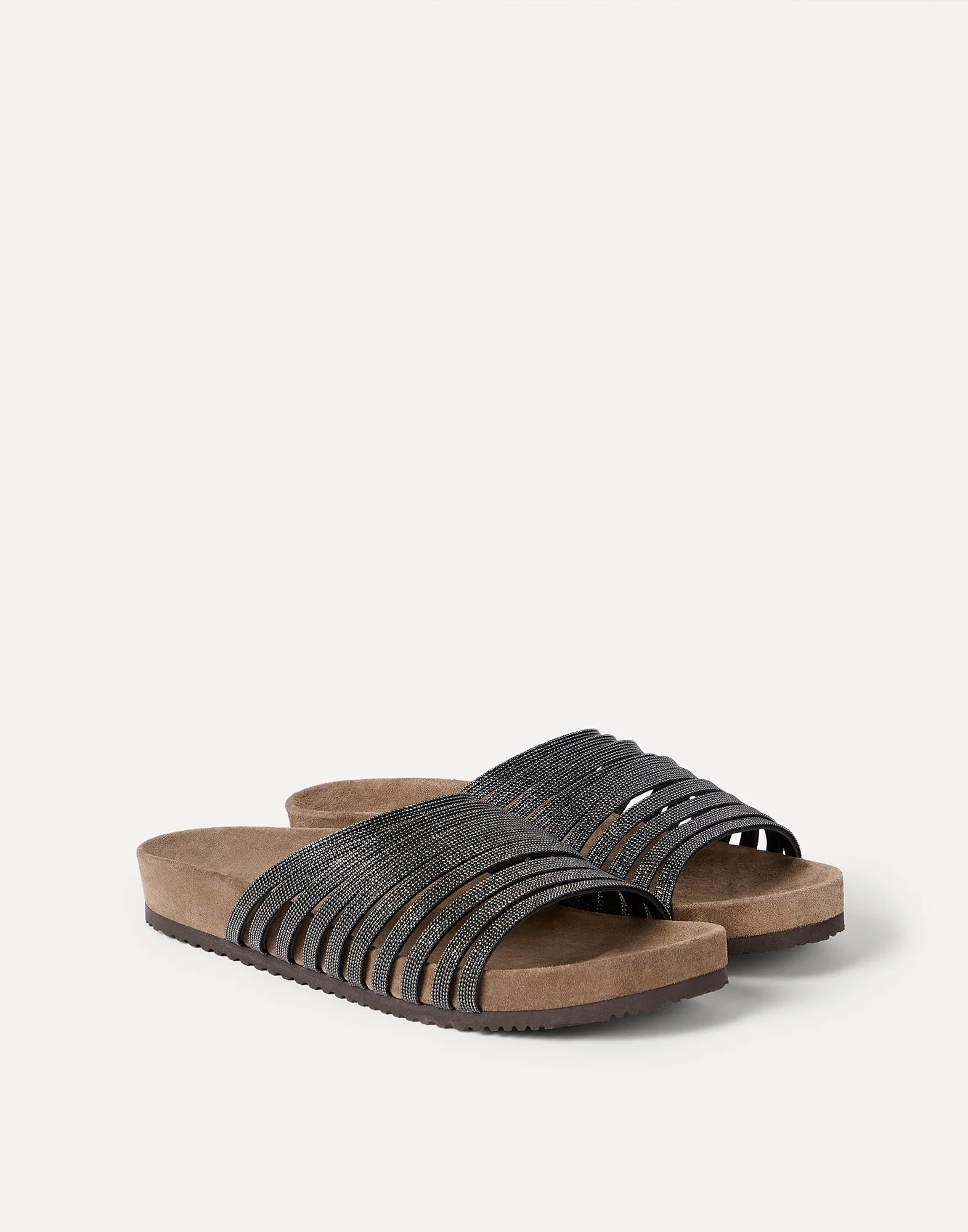 A summery feel and refined details define the style of these suede slides. The leather’s velvety texture that entirely covers the footwear is paired with a minimal design, a perfect balance between casual elegance and comfort. An interplay of horizontal bands, enriched with precious monili, brings the embellished upper to life with a distinctly feminine allure. MATERIALS The refined suede is a compact leather with a soft, velvety texture. DETAILS Suede lining Sole in lightweight micro rubber TPU rubber tread Nickel-free monili decoration 100% REAL LEATHER