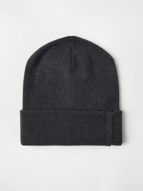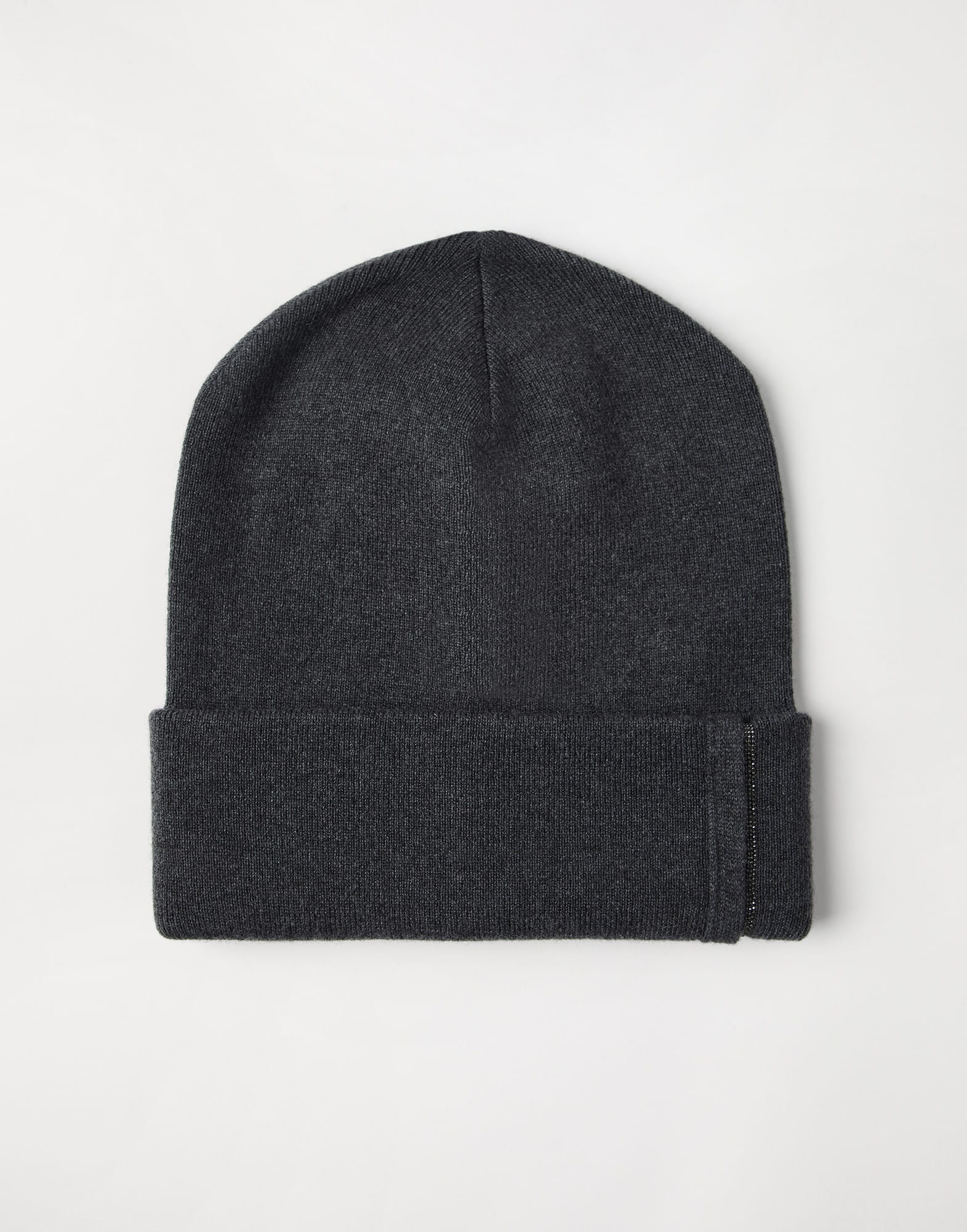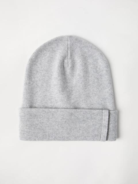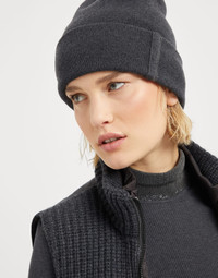 Refined pure cashmere yarn adds an elegant touch to this beanie, which is perfect for complementing a winter look with a sophisticated note. Classic rib knitting is paired with a band made of embroidered rows of shiny monili for a precious detail in true Brunello Cucinelli style. MATERIALS The noble cashmere fiber is characterized by an extreme fineness and also for its precious insulating qualities which guarantee warmth, providing coverage and lightness when worn. DETAILS Plain stitch Nickel-free monili decoration 100% CASHMERE