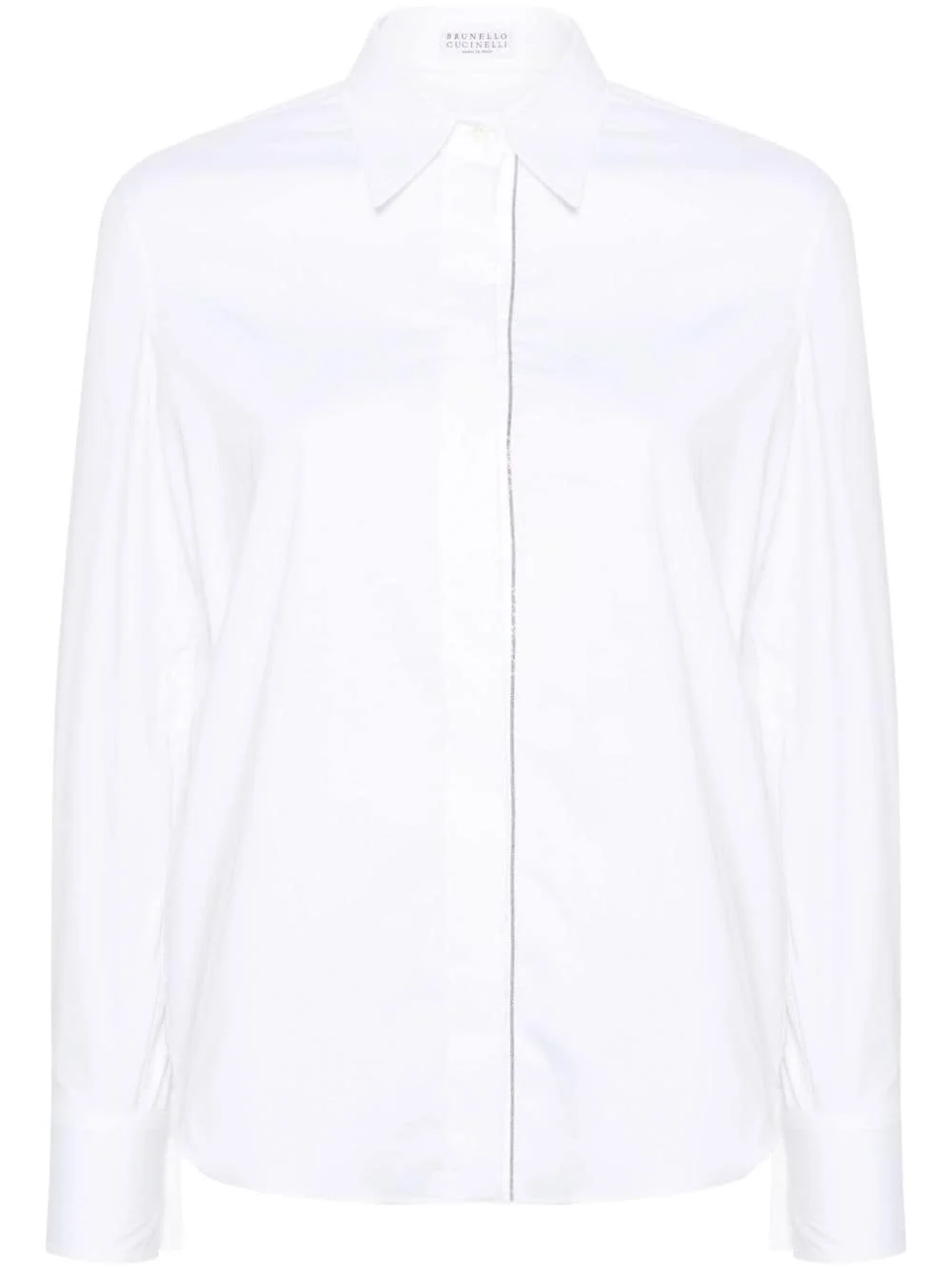 beaded-trim poplin shirt Highlights - White/silver-tone - Cotton blend - Stretch-design - Poplin texture - Beaded trim detail to the front - Pleat detailing to the cuffs - Straight-point collar - Long sleeves - Buttoned cuffs - Concealed front button fastening - Curved hem - Unlined Made in Italy Composition Eco Brass 100%, Cotton 72%, Polyamide 23%, Elastane 5% SIZE & FIT Model measurements Height 5 ft 10 in(1.78 m) Bust/Chest 33.07 in(84 cm) Hips 35.82 in(91 cm) Waist 25.98 in(66 cm) FittingInformation Designed for a relaxed fit, this piece allows for comfort and movement when worn Made from a midweight stretch fabric, this piece offers elasticity and flexibility when worn This piece fits true to size – take your usual size