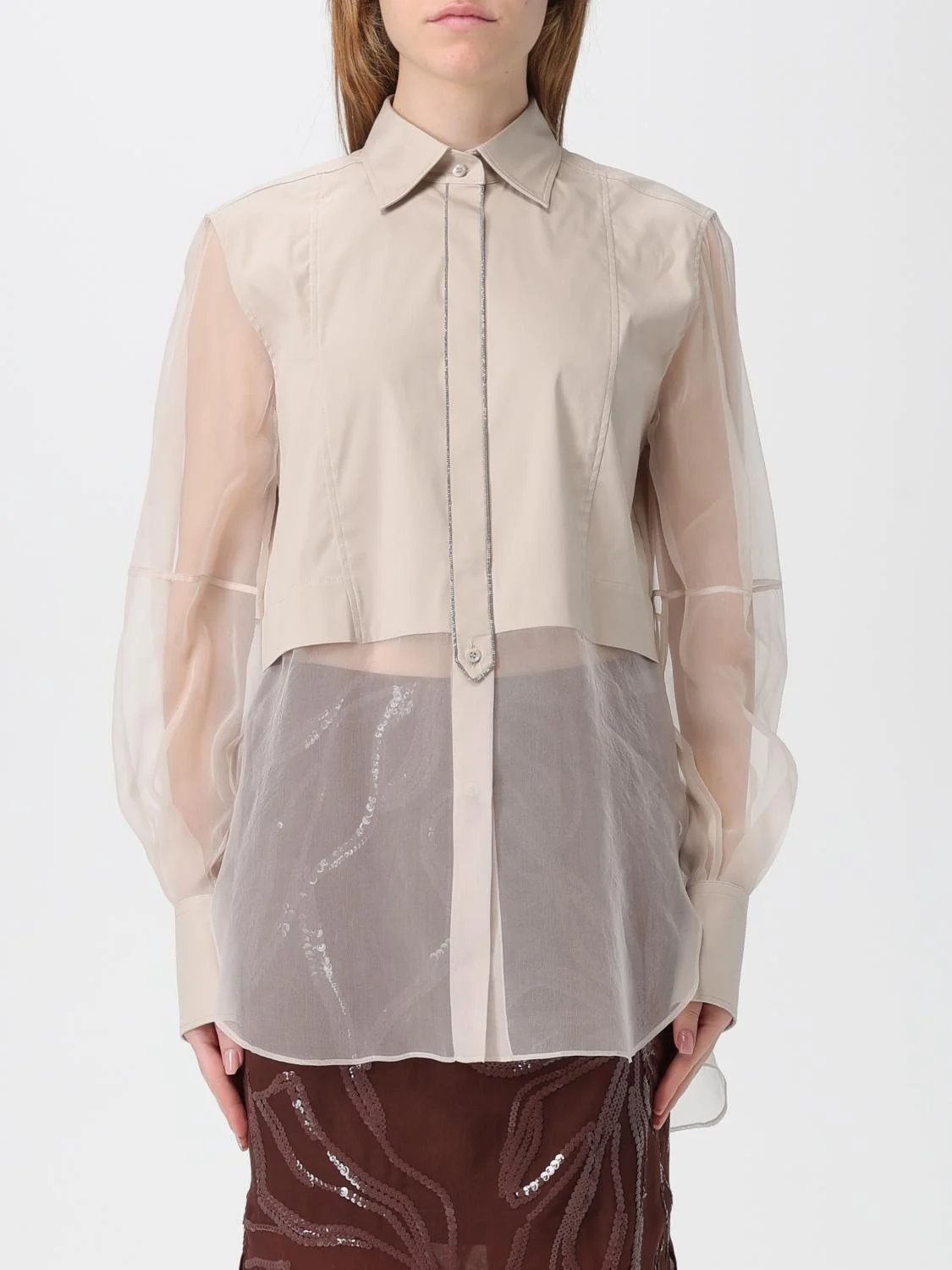 DESCRIPTION - Style: Elegant, Formal - Neck: Classic - Shoulders: Regular - Sleeves: Long sleeve shirts - Closure: Concealed buttons - Bottom: With curved hemline - Details: With nickel-free jewels - Materials: Cotton blend - Pattern: Embroidery, Plain-colored DETAILS AND CARE Composition _72% CO 23% PA 5% EA SIZE AND FIT Sizes not available Size and fit Regular fit Designer code: MP091MQ406 C7498 Giglio Code: H37556 Designer: Brunello Cucinelli Collection: Brunello Cucinelli Woman Category: Clothing Brunello Cucinelli
