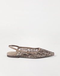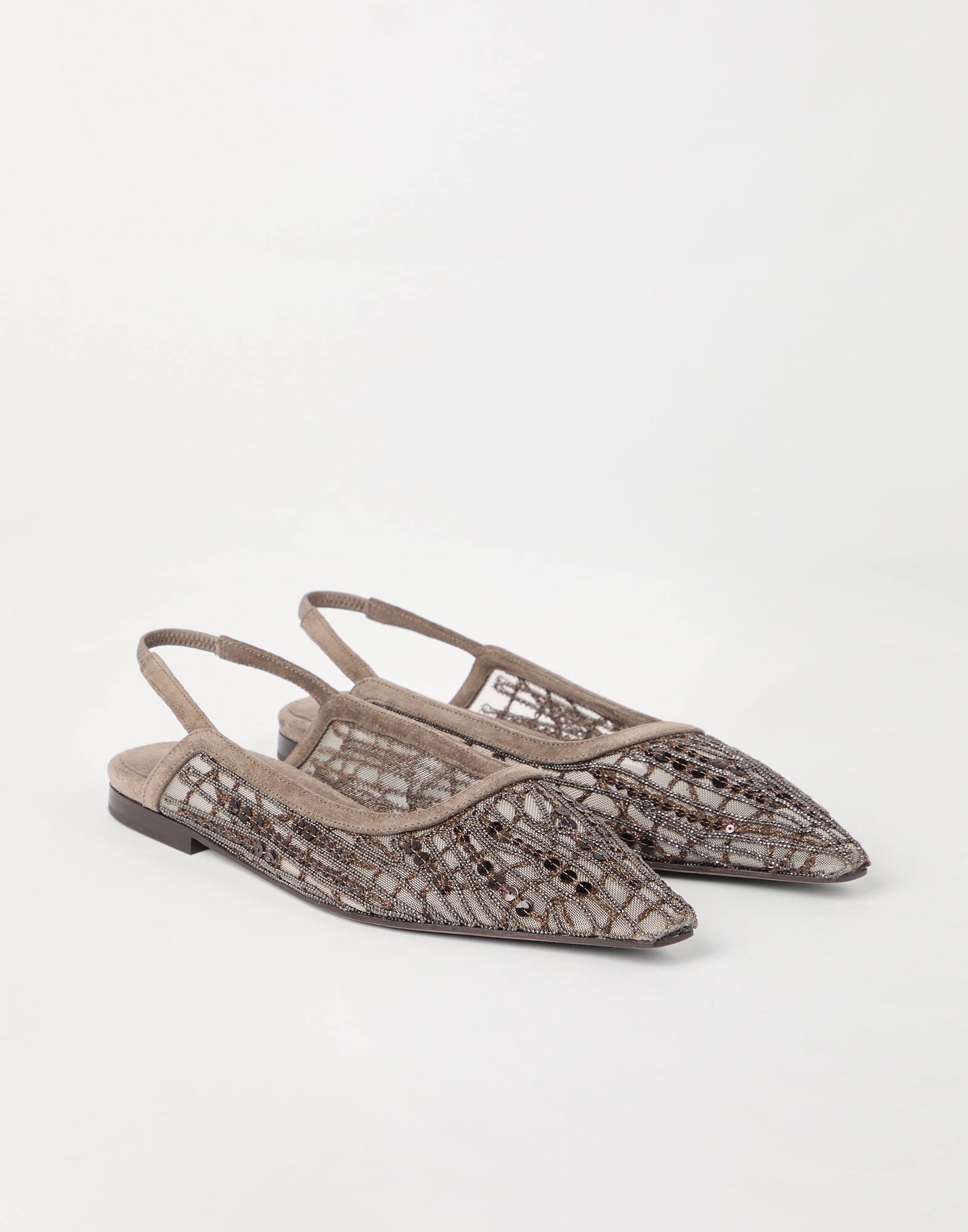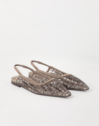 The season's precious Glistening Abstract Embroidery enriches the design of these new Slingback flats. Monili, the iconic embellishment of the Brunello Cucinelli collections, becomes the star of this sophisticated net-like craftsmanship to create bejeweled footwear with a distinctly feminine feel. Shiny sequins stand out on the netting which, together with the fine strands of monili, spread shimmering reflections throughout the silhouette. A thin elastic strap makes wearing easy. MATERIALS Precious strands of monili, held together by shimmering lurex thread, are used to create an irregular-looking net. The sophisticated workmanship gives the structure a solid yet fluid nature, thanks to the extraordinarily fine yarns. The suede lining perfects the footwear’s comfort. DETAILS Rear elastic band Suede lining Non-slip TPU rubber at heel and toe Nickel-free monili decoration 86% VISCOSE, 14% POLYESTER