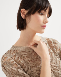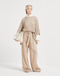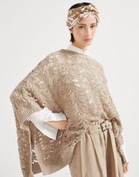 Generous lines and the refined craftsmanship of knitwear come together in this new Foliage Lace knit poncho. The silhouette is characterized by sophisticated knitting reminiscent of elegant lace with a delicate nature-inspired Foliage pattern. The garment’s openwork is enriched with small flashes of sequins set into the yarn, creating a feminine sparkling note. MATERIALS The slubbed linen yarn gives the openwork a three-dimensional look, highlighted by the shiny sequins of the silk Diamond yarn. DETAILS Crew-neck Net knitting 63% LINEN, 26% POLYESTER, 11% SILK