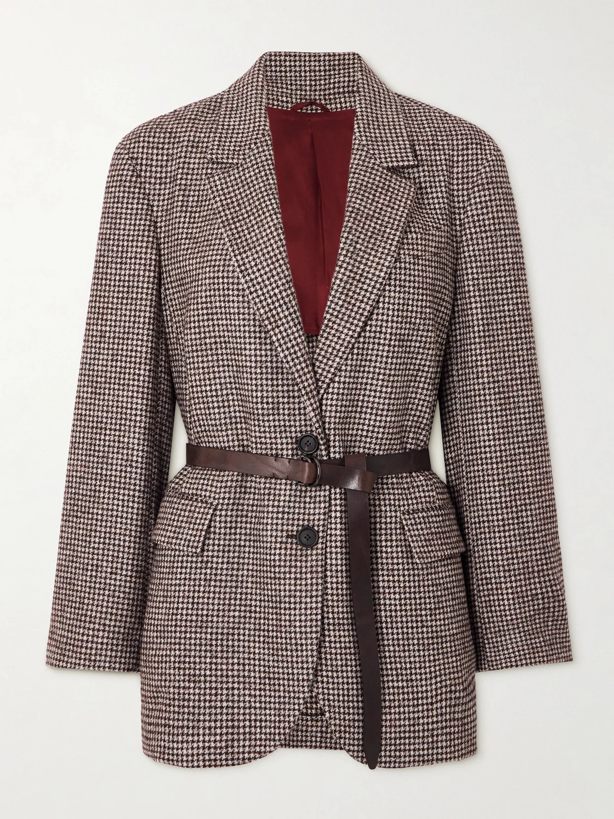 Brunello Cucinelli's jacket is traced with rows of sparkling Monili beads along the collar - wear yours up to show off the detail. Tailored in Italy from wool-blend with plenty of cozy alpaca, it's patterned with classic houndstooth checks and has a leather belt that cinches the waist. The partial satin lining ensures smooth layering.