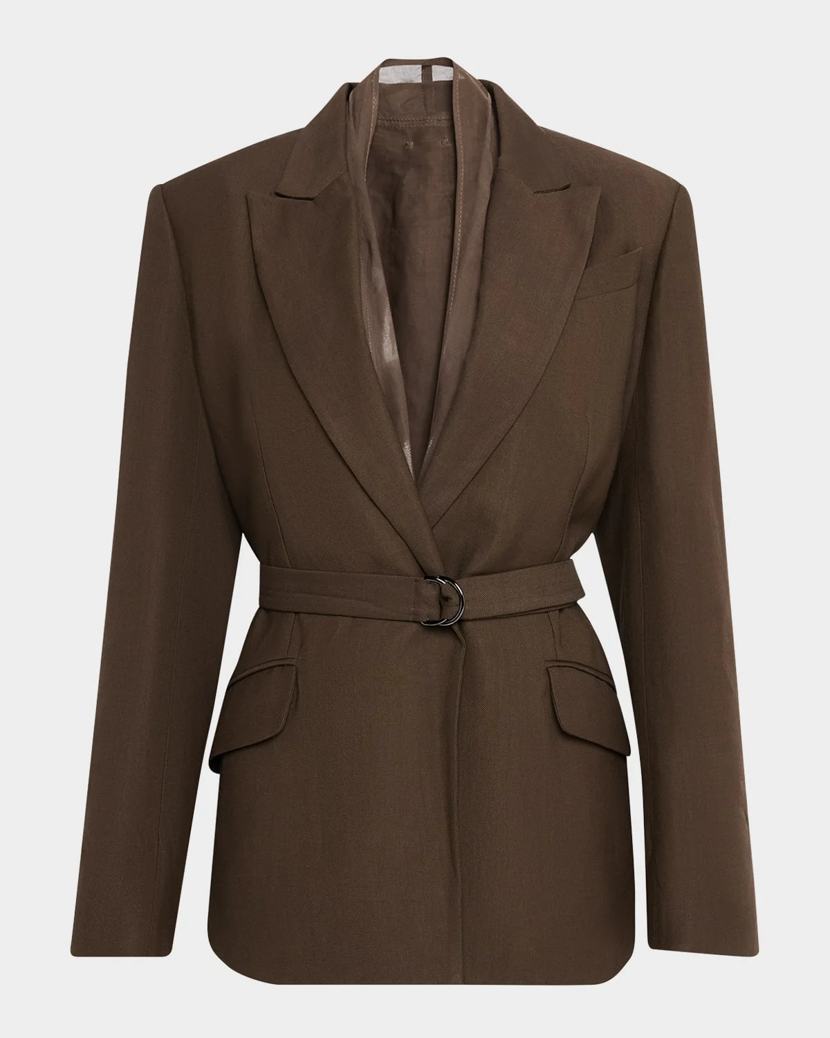 Brunello Cucinelli twill blazer with an adjustable waist belt Peak lapels Long sleeves Chest welt pocket; waist flap pockets Straight fit Viscose/linen Dry clean Made in Italy