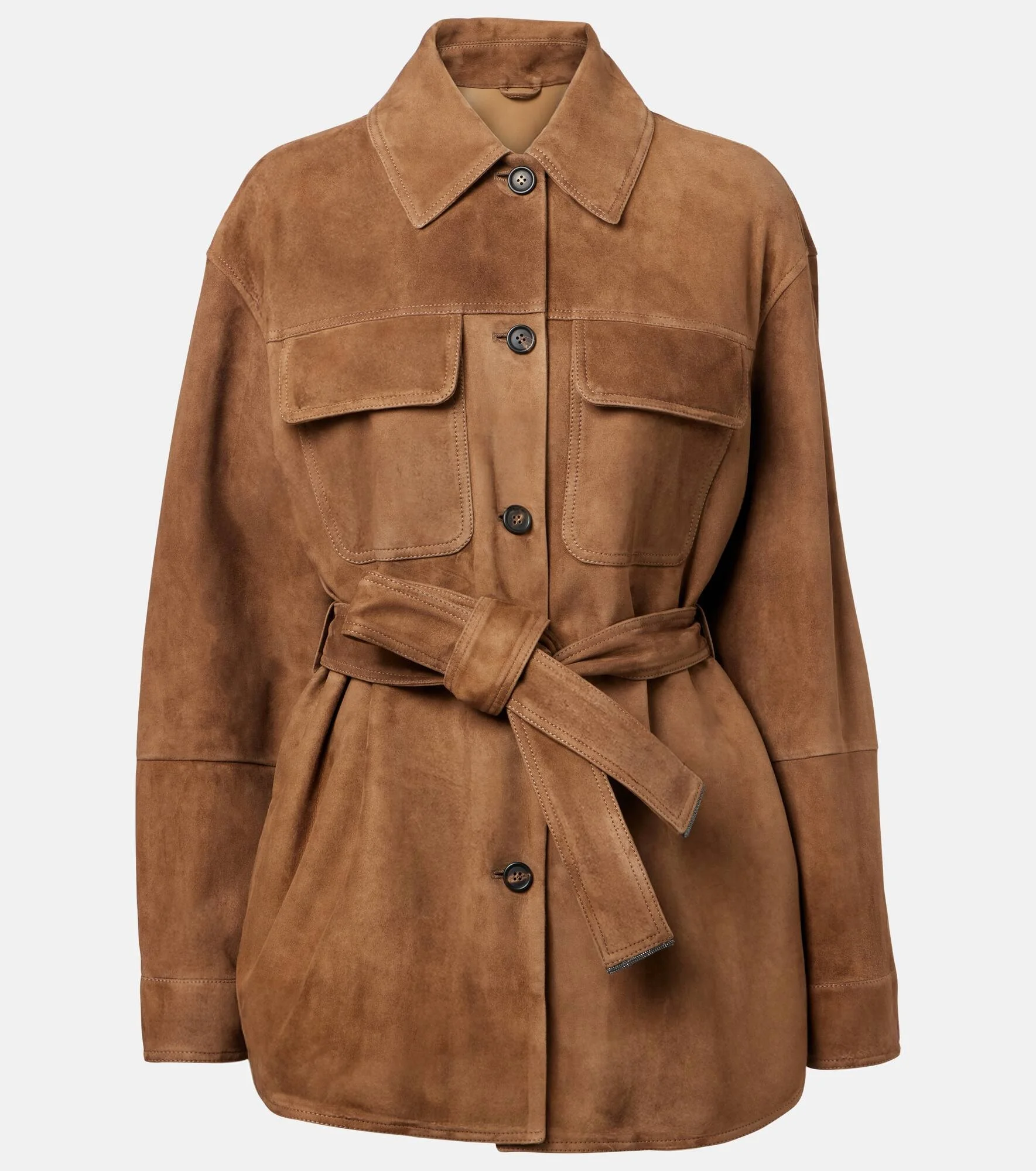 Expertly crafted in Italy from lamb suede, this Brunello Cucinelli field jacket is a refined statement piece. The design features flap and slit pockets, 5-button placket, and a detachable belt for versatile styling. Product Details - Material: 100% leather - Care instructions: specialist clean - Made in Italy - Designer color name: Sesamo - Item color: brown - Pocket lining: 74% acetate, 26% silk - Contains non-textile parts of animal origin - Pockets: flap chest pockets, side slit pockets - Detachable belt - Closure: buttoned front - Includes: garment bag - Item number: P01054294 Size & Fit - True to size - Dropped shoulders - Loose fit, comes with belt - Non-stretchy fabric - Falls below the hip - The model seen in the picture is 178cm-5'10" and wearing a size IT 40