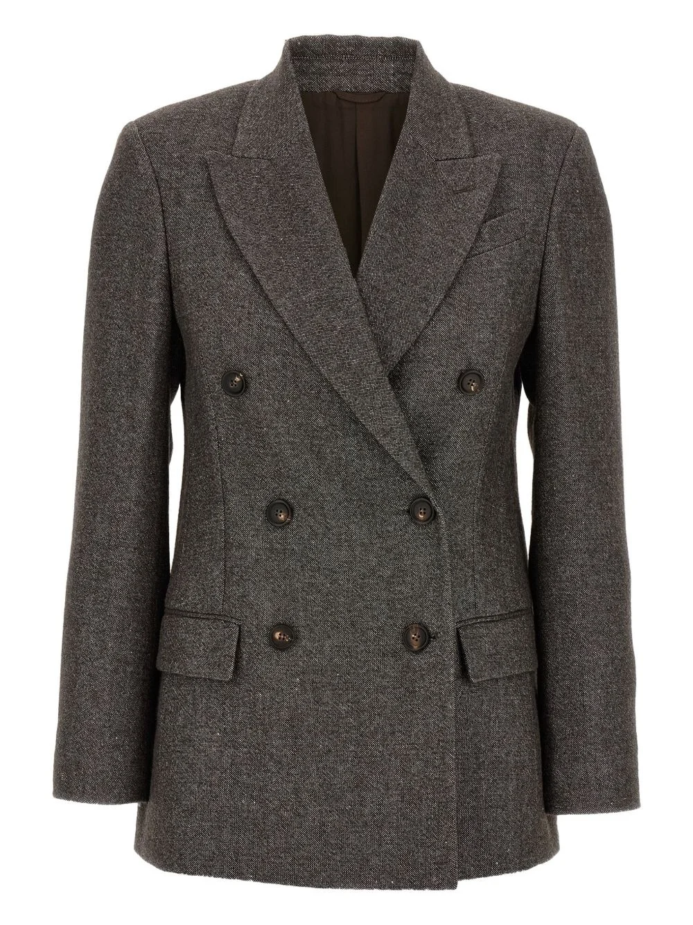 tweed double-breasted blazer Highlights - Brown - Front button fastening - Two side flap pockets - Long sleeves - Buttoned cuffs Made in Italy Composition Outer: Virgin Wool 51%, Wool 36%, Polyamide 12%, Elastane 1% Lining: Silk 100% Washing instructions Read Manufacturer Guidelines