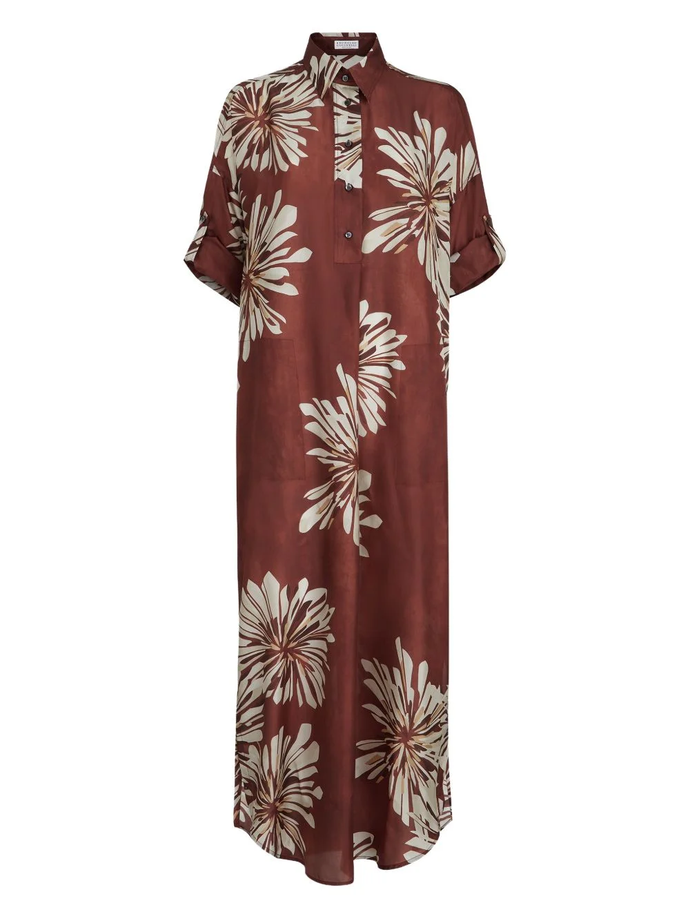 bloom-print monili-detail maxi dress Highlights - Dark red - Bloom print - Monili detail - Front button fastening - Long sleeves Made in Italy Composition Silk 100% Washing instructions Specialist Cleaning