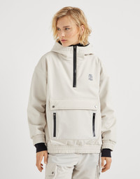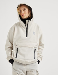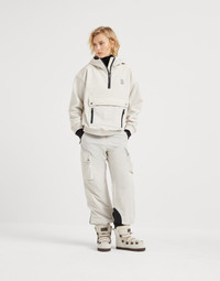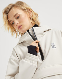 Functional elements and refined materials are the inspiration for this Mountain outerwear jacket, designed for being active at high altitudes. The bonded techno fabric perfectly complements the sporty attitude of the hood and front pockets. The lightweight Thermore® padding ensures optimal comfort and protection. A shiny monili embroidery runs along the zipper closure and completes the garment with a feminine note in true Brunello Cucinelli style. MATERIALS Perfect for garments with a sporty feel that pair contemporary style and function, the techno fabric is characterized by a very smooth hand. A thin membrane ensures the right protection, without compromising lightness, while the soft fleece interior provides added comfort. DETAILS Zip opening Unlined Lined hood and adjustable drawstring Zipper vents on the inside of the sleeve Large central pocket Hand pockets with zipper Pocket on sleeve Windproof cuff Elasticized hem Thermore® padding Nickel-free monili decoration 85% NYLON, 15% ELASTANE
