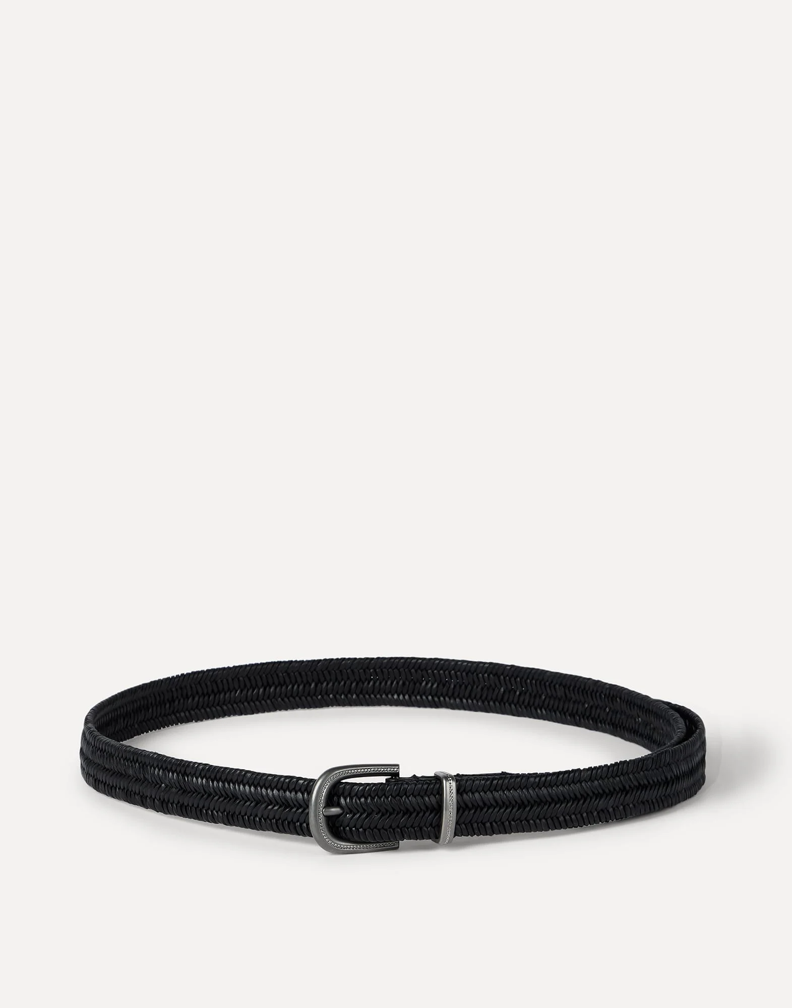 The crafting of refined woven leather enriches the contemporary style of this belt with a special three-dimensional texture. The contrasting buckle and loop give the accessory a shiny note. MATERIALS The woven design of the belt is made with refined calfskin leather, characterized by a rich, even grain. The small percentage of synthetic fiber makes the leather more elastic. DETAILS Belt height approx. 2.5 cm (0.98") All metal parts are Nickel-free 70% REAL LEATHER, 23% VISCOSE, 7% RUBBER