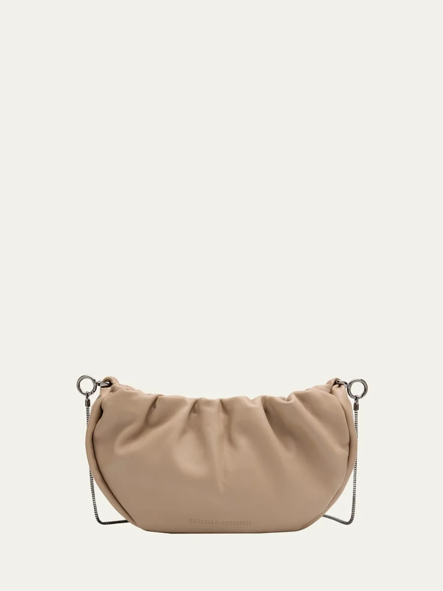 Brunello Cucinelli "Brioche" ruched calf leather shoulder bag with logo accent Detachable monili chain shoulder strap Zip top closure Interior, one card slot Approx. 4.7"H x 10.2"W x 3.5"D Made in Italy