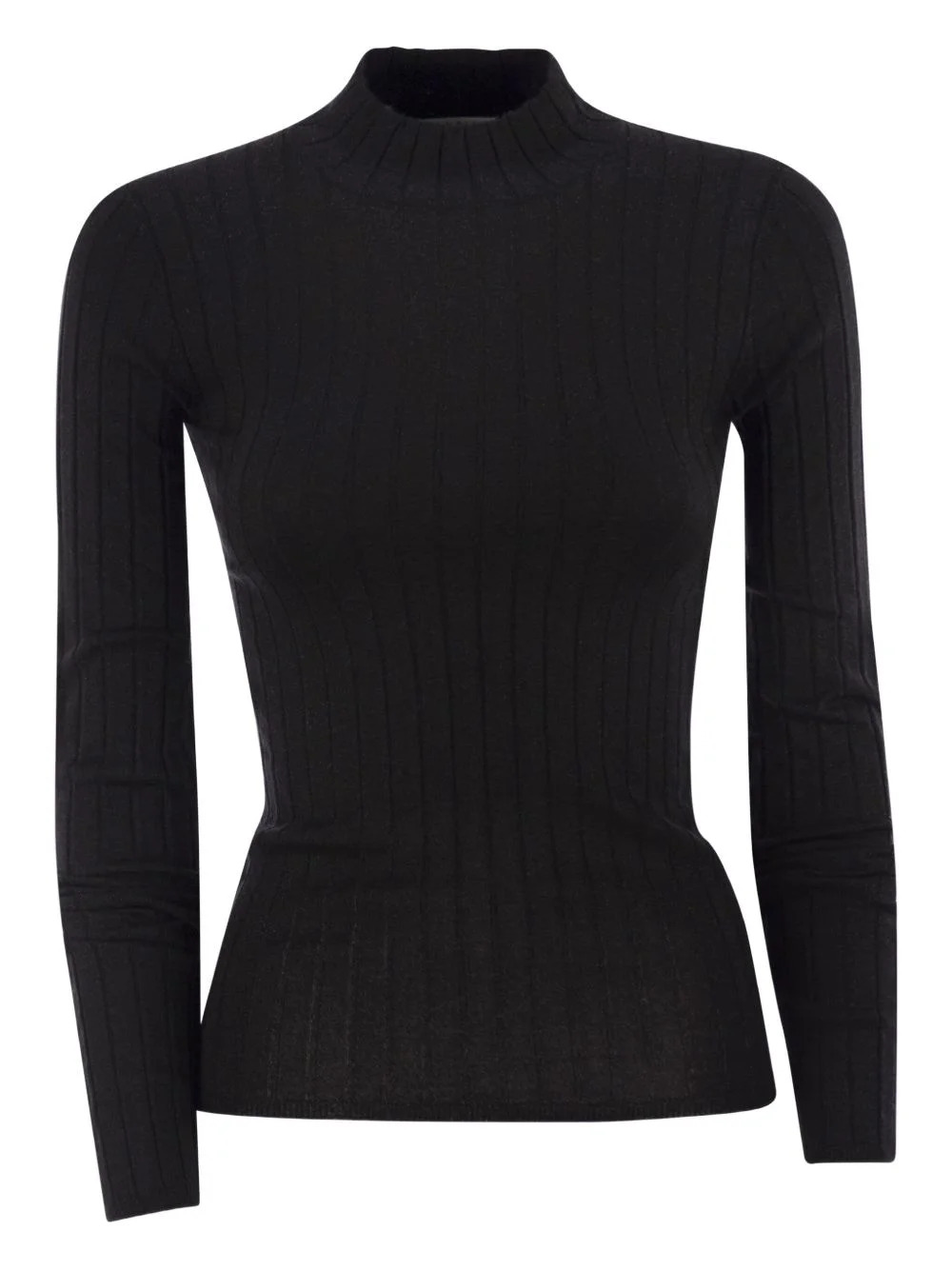 broad rib high-neck knitwear Highlights - Black - Broad rib - Shaved knit - Regular shoulder Made in Italy Composition Cashmere 51%, Silk 22%, Polyamide 20%, Metallised Fibres 7% Washing instructions Read Manufacturer Guidelines