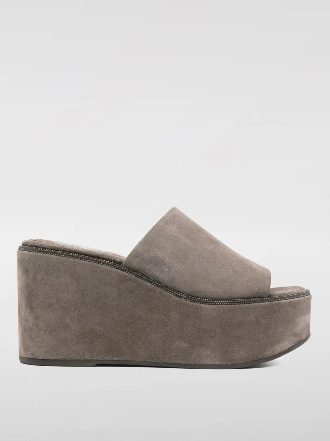 DESCRIPTION - Details: With nickel-free jewels - Lining: With logo, Suede leather - Model: Slip on - Toe: Open, Round - Sole: Real suede - Heel: High - Materials: Suede calfskin - Pattern: Plain-colored DETAILS AND CARE Composition 100% calfskin leather (Bos Taurus) SIZE AND FIT Sizes Heel: 9,5 cm Designer code: MZSFG1996 C8187 Giglio Code: G52649 Designer: Brunello Cucinelli Collection: Brunello Cucinelli Woman Category: Shoes Brunello Cucinelli