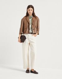 Refined details and the season’s colors enrich the casual style of these new denim Crop trousers. Characterized by slight shading, the lightweight garment-dyed fabric pairs perfectly with the “cropped” cut, while the fit features straight, slightly wide lines. MATERIALS The dyeing process carried out on the finished garment gives the pure cotton denim a delicate color with a slightly irregular appearance, creating light shading on the surface. DETAILS Zip closure with button Front pockets with watch pocket Back patch pockets 100% COTTON