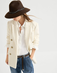 The excellence of Brunello Cucinelli yarns enriches the sartorial feel of this cashmere knit blazer. The traditional cable knitting gives the garment a casual elegance, while enhancing the yarn’s natural softness. The design offers a slightly oversized cut, emphasized by the pronounced peak lapels, generous shoulders and the double breasted closure that evoke the world of classic masculine elegance. The iconic monili embroidery completes the blazer with a delicate sparkle. MATERIALS The noble cashmere fiber is characterized by an extreme fineness and also for its precious insulating qualities which guarantee warmth, providing coverage and lightness when worn. DETAILS Metal button closure Silk-blend crepe lining Peak lapel Welt pockets with flap and chest pocket Cuffs have four metal buttons Single back vent Cable knit Nickel-free monili decoration 100% CASHMERE