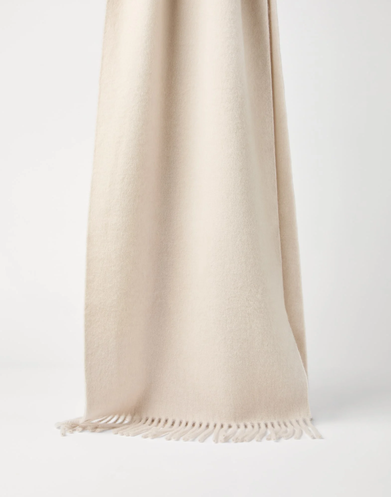 The excellence of Brunello Cucinelli materials elevates the style of this new cashmere scarf. This elegant and versatile accessory features an extremely soft and ethereal texture that highlights the seasonal nuances and lends understated elegance to the design. The fringe on the short side complements the design. MATERIALS The beauty of the cashmere fiber enhances the soft scarf, ideal for periods of transition. DETAILS Scarf measures approx. 39 cm x 208 cm Short side with fringe 100% CASHMERE