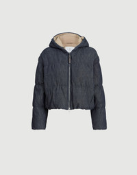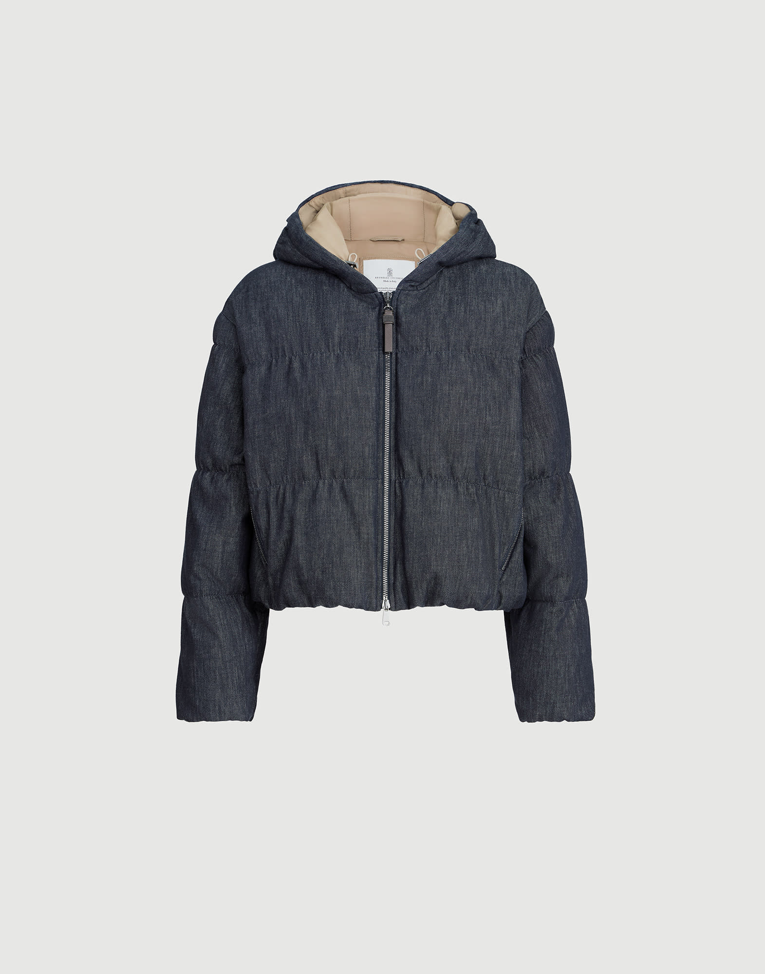Practical and casual, yet elegant at the same time, this refined down jacket in cotton denim-effect twill is perfect to wear in the transitional months between seasons. The soft, high-quality padding, practical drawstring hood and the elasticized bottom that gathers the volume of the silhouette ensures the comfort of the garment. A shiny monili embroidery, the iconic embellishment of the Brunello Cucinelli collections, adds a delicate sparkle. MATERIALS Characterized by a look reminiscent of classic denim, the pure cotton twill is a lightweight, comfortable fabric, suitable for wearing during the warmer months. DETAILS Two-way zip closure Lined hood and adjustable drawstring Elastic cuffs Hand pockets with zipper Water-resistant nylon lining All padding is certified according to the RDS (Responsible Down Standard) Elasticized hem Nickel-free monili decoration 100% COTTON