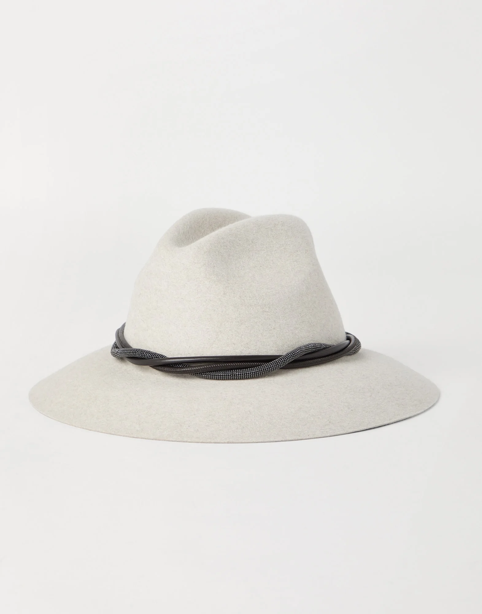 Refined details enhance the timeless style of this classic felt fedora. Two soft interwoven tubular bands are entirely covered with rows of monili to create a shimmering texture that enriches the accessory’s essential look with delicate touches of sparkle. MATERIALS Made of natural fibers, the felt is a warm, compact fabric that guarantees protection and comfort when worn. DETAILS Unlined Nickel-free monili decoration 100% FELT
